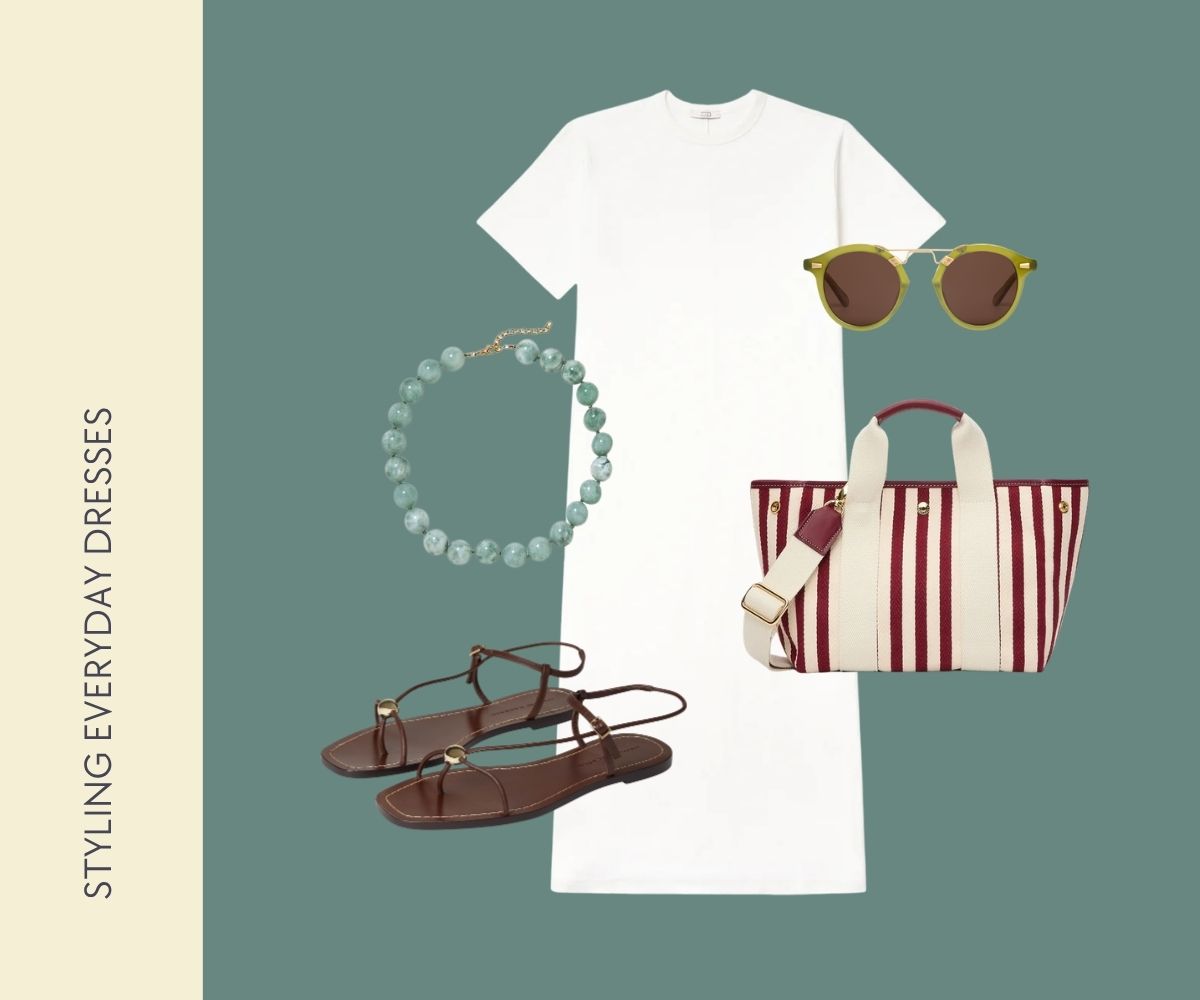 SANDALS // TEE SHIRT DRESS // BEADED NECKLACE // STRIPED BAG // SUNNIES