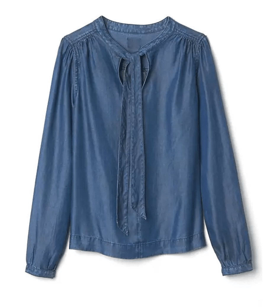 Very into this denim tie-neck blouse from Gap ($59). (I’m very into denim more generally R.N. — especially the joverall.) It scratches an itch I’ve had since spotting this $325 Piamita denim statement top.