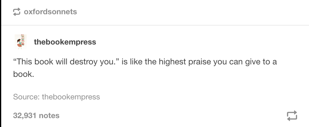 This is SUCH a well-considered point; “good books” don’t need to destroy us, and, as we’ve talked about dozens and dozens of times on the blog, there are many reasons and ways to read, and all are legitimate. I love this reminder!