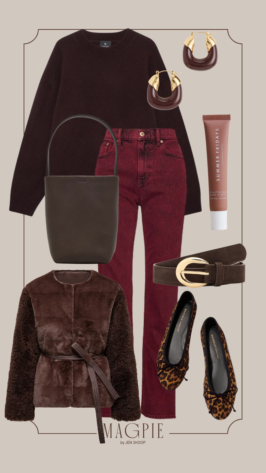 CASHMERE LEE CREW SWEATER // HIGH RISE 90S STRAIGHT JEANS // PARK TEXTURED LEATHER TOTE // MINI ORGANIC HOOPS // LEATHER BELT WITH OVAL BUCKLE // LIP BUTTER BALM // MARGAUX FLATS // MONCLER JACKET
