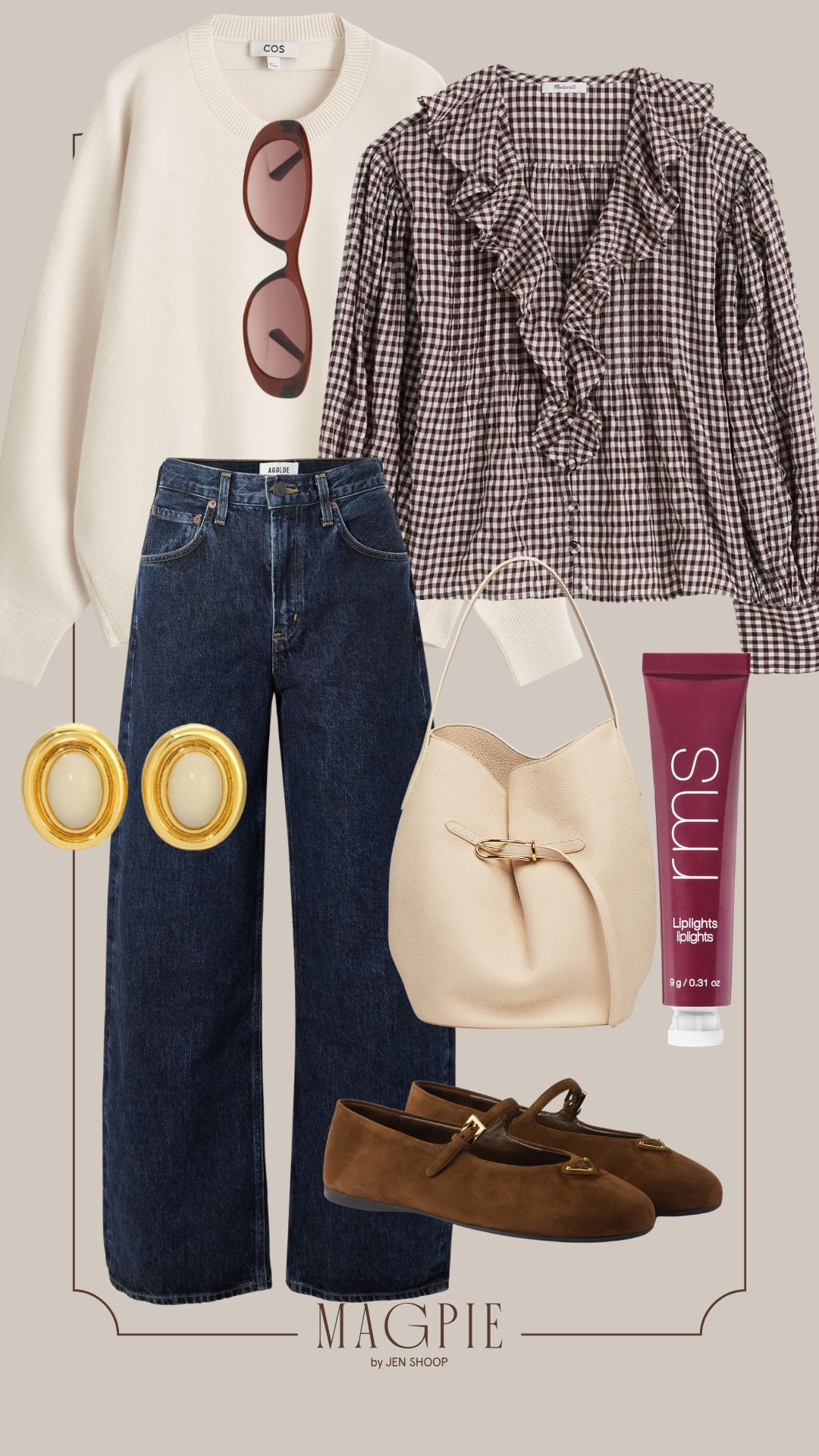 RUFFLED PINTUCK TOP // ROUNDED DOUBLE LAYER WOOL // LOW CURVE JEANS // PRADA FLATS // LIFFNER LARGE BELTED BUCKET BAG // PRIZE EARRING // OVAL FRAME SUNGLASSES // LIPLIGHTS CREAM LIPGLOSS