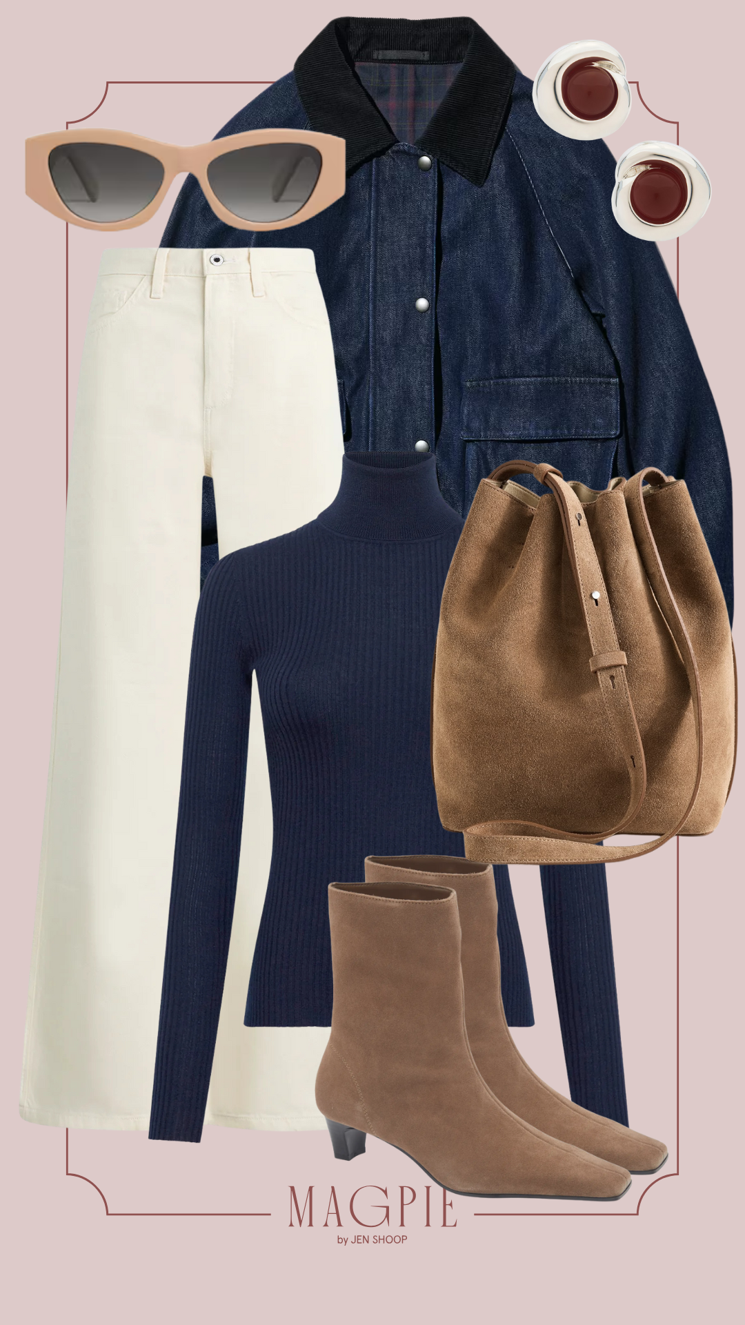 BARN SHORT JACKET // MASHA JEANS // PEPPE KNIT TURTLENECK // COLLIN KITTEN HEEL ANKLE BOOTIE // MARIN MEDIUM BUCKET BAG // OVAL ACETATE SUNGLASSES // AGNES EARRING