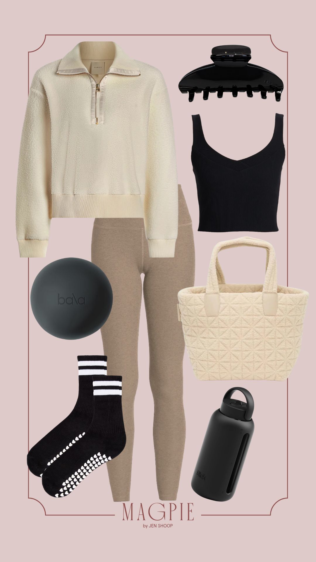 VARLEY FLEECE // MPULSE RIBBED CROPPED TANK // CAUGHT IN THE MIDI // PILATES BALL // STRIPED TUBE GRIP SOCK // VEE COLLECTIVE SHERPA BAG // DAY BOTTLE // BIG EFFING CLIP