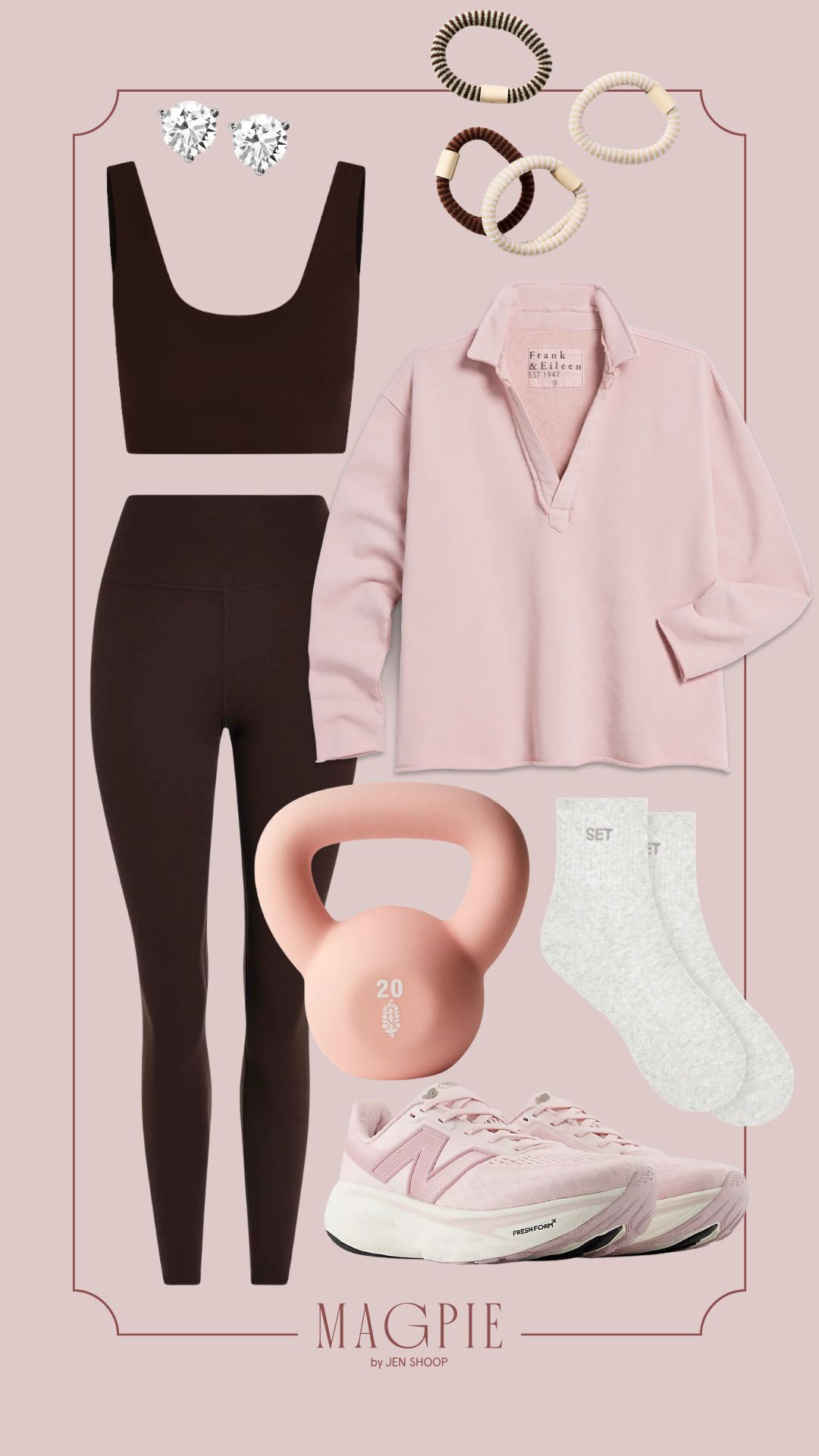 CORI SPORTS BRA // FREESOFT LEGGINGS // FRESH FOAM NEW BALANCE SNEAKERS // 20 POUND KETTLEBELL // FRANK AND EILEEN POPOVER // SET ACTIVE SOCKS // HAIR TIES // DORSEY STUDS