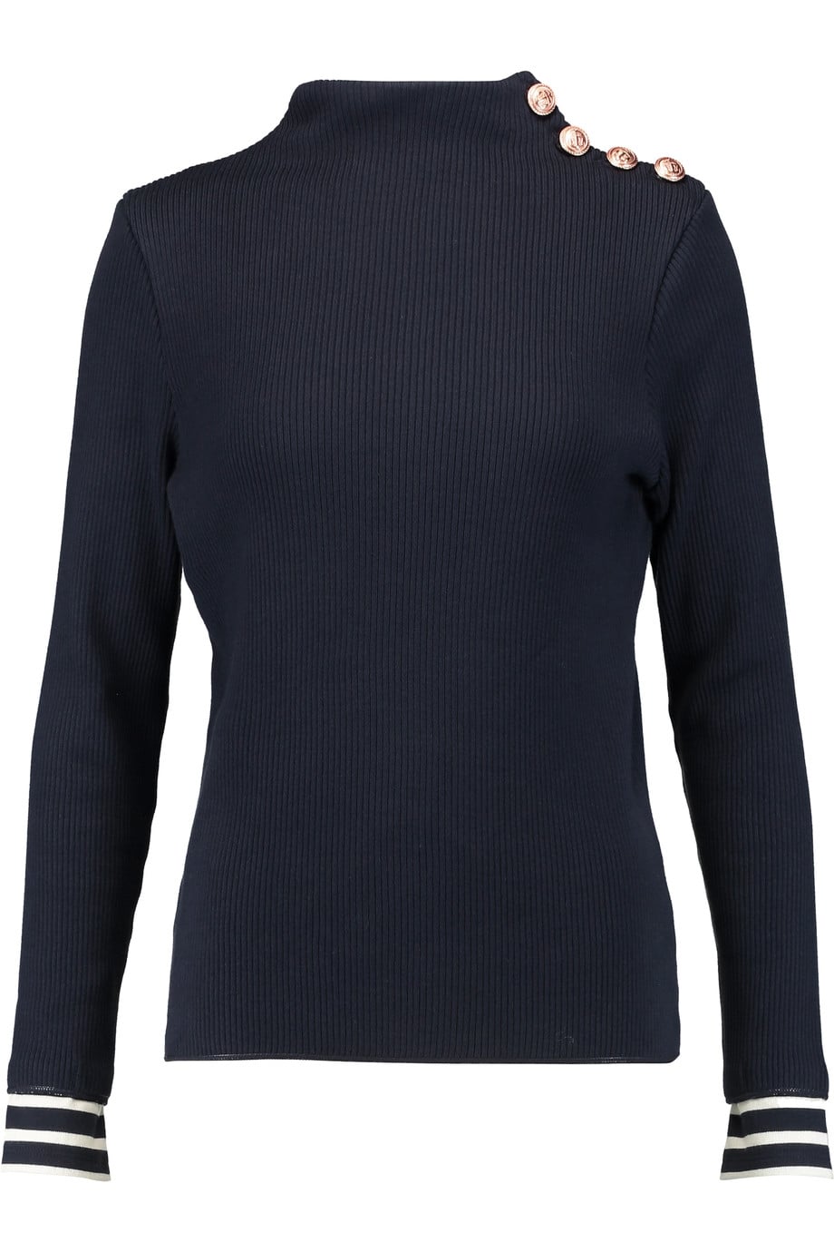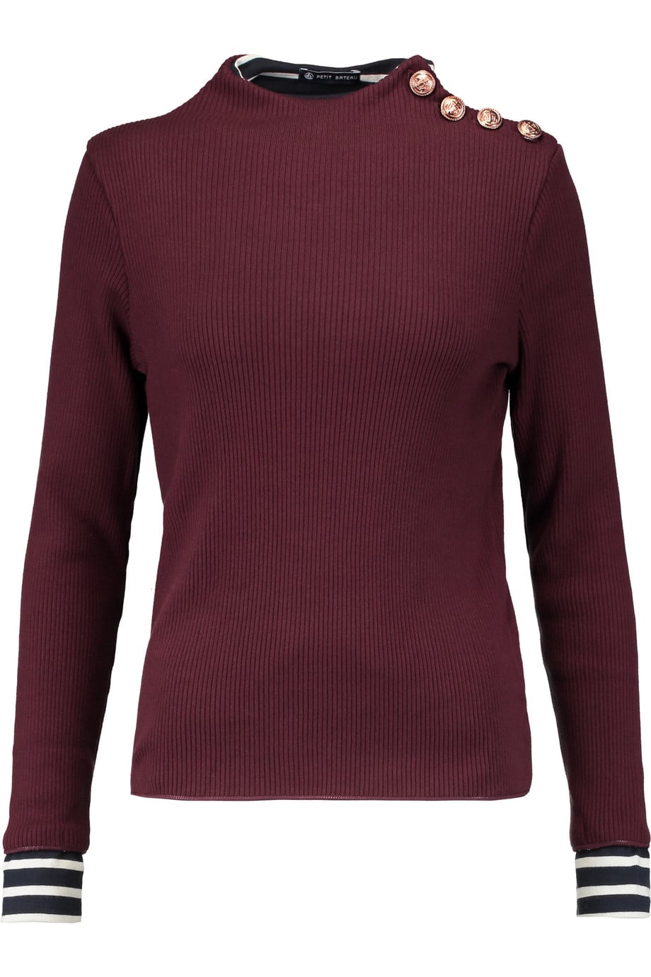 Speaking of gleaming gold buttons, I’m loving the look of these slim-fit, button-embellished rib-knit sweaters from Petit Bateau, especially the merlot-colored one with those sporty cuffs (on sale for $65), though the navy is equally compelling. (Also love this striped variation, or this similar J. Crew style.)