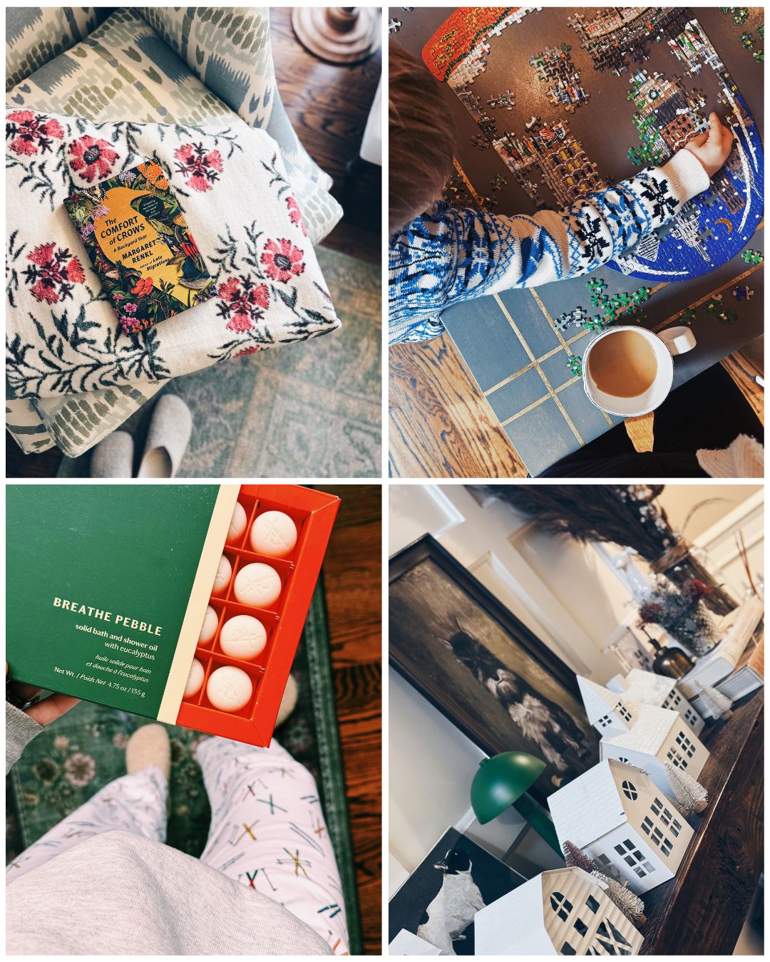 Ahhh this is my favorite morning vignette, too — Chappywrap, book, fire, coffee! It is so comforting.