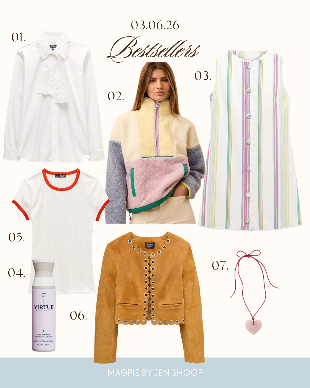 01. CHICEST WHITE BLOUSE // 02. COLORBLOCKED FLEECE // 03. FOR THE SECOND OR THIRD WEEK RUNNING, THIS DARLING STRIPED MINI // 04. BEST SHAMPOO, 25% OFF + FREE SHIP // 05. POINTELLE TEE // 06. GORGEOUS CROPPED SUEDE JACKET // 07. HEART NECKLACE // 08. CASHMERE BANDANA SCARF // 09. CLOUDMONSTERS! (MY FAVORITE WALKIN’ SHOE) // 10. MADEWELL BLOUSE
