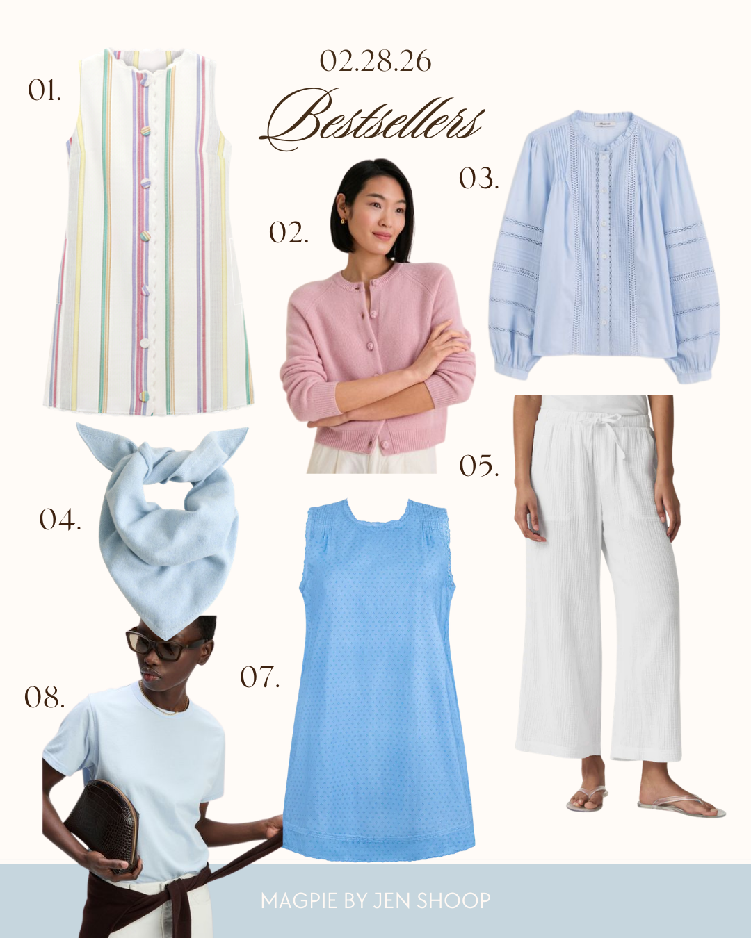 01. TUCKERNUCK ISLA DRESS // 02. CASHMERE CARDIGAN // 03. MADEWELL PINTUCK BLOUSE // 04. CASHMERE TRIANGLE SCARF // 05. GAUZE PALAZZO PANT (GIFT FOR OUR FUTURE SELVES) // 06. PINK JEANS! // 07. MINNOW DRESS // 08. FAV TEE IN A NEW PASTEL BLUE HUE // 09. STRIPED BOXY TEE // 10. CHICEST SPLURGEY ONE-PIECE
