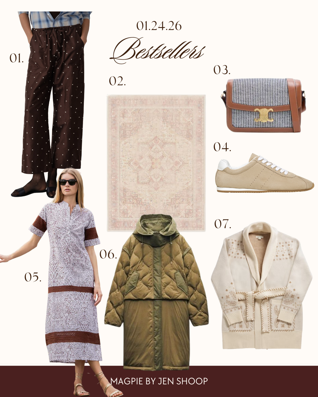 01. DONNI TAFFETA PANTS // 02. KAMRAN RUG // 03. VIVRELLE MEMBERSHIP* — A LOT OF SIGN UPS! // 04. MY FAVORITE NEUTRAL SNEAKERS (I HAVE IN LATTE COLOR – SO COMFORTABLE) // 05. JULIA AMORY CAFTAN // 06. RAG + BONE CONVERTIBLE COAT // 07. SHAWL COLLAR SWEATER // 08. MINI NUAGE CARDIGAN // 09. TUCKERNUCK CAFTAN // 10. ALEX MILL TOTE (I OWN IN GREEN AND AM OBSESSED — MY GO-TO WEEKDAY TOTE)