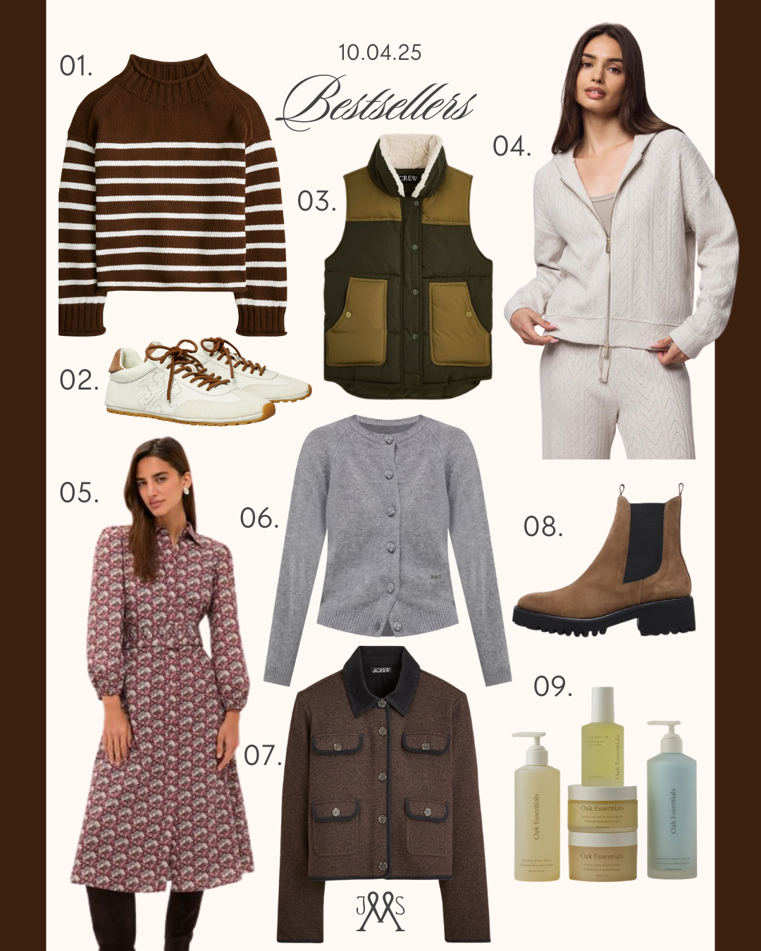 01. ROLLNECK SWEATER // 02. FIELD SNEAKERS // 03. PUFFER VEST // 04. SWEATER HOODIE // 05. FAMILY PHOTO DRESS // 06. CASHMERE CARDIGAN // 07. KNIT LADY JACKET // 08. RAIN-RESISTANT BOOTS // 09. OAK ESSENTIALS BODY BUNDLE // 10. SILK DUPIONI TROUSERS
