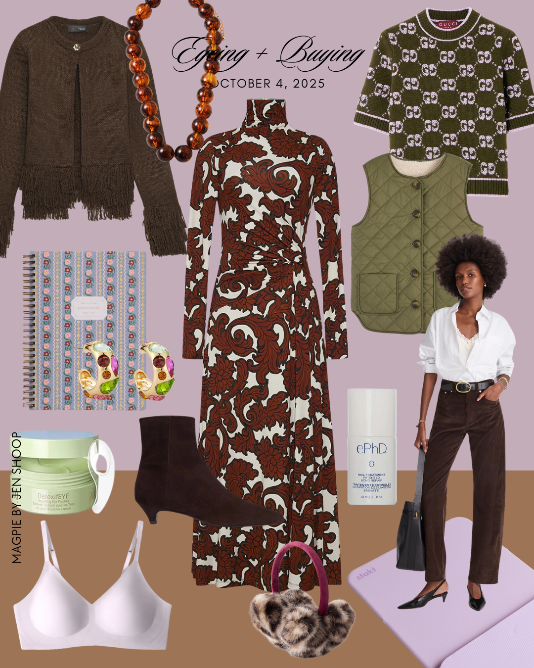 FRINGE KNIT // ERIN MCDERMOTT NECKLACE // RIFLE PAPER NOTEBOOK // MIGNONNE GAVIGAN EARRINGS // PIXI EYE PATCHES // ALEX MILL X MARGAUX BOOTIES // EBY BRA (BOGO WHEN ADDED TO CART!) // CARA CARA DRESS // PRADA SHEARLING SLIDES // GIRLS EARMUFFS // GUCCI KNIT // BODEN REVERSIBLE GILET // EPRES NAIL BOND TREATMENT // MADEWELL BARREL LEG CORDS // STAKT MAT