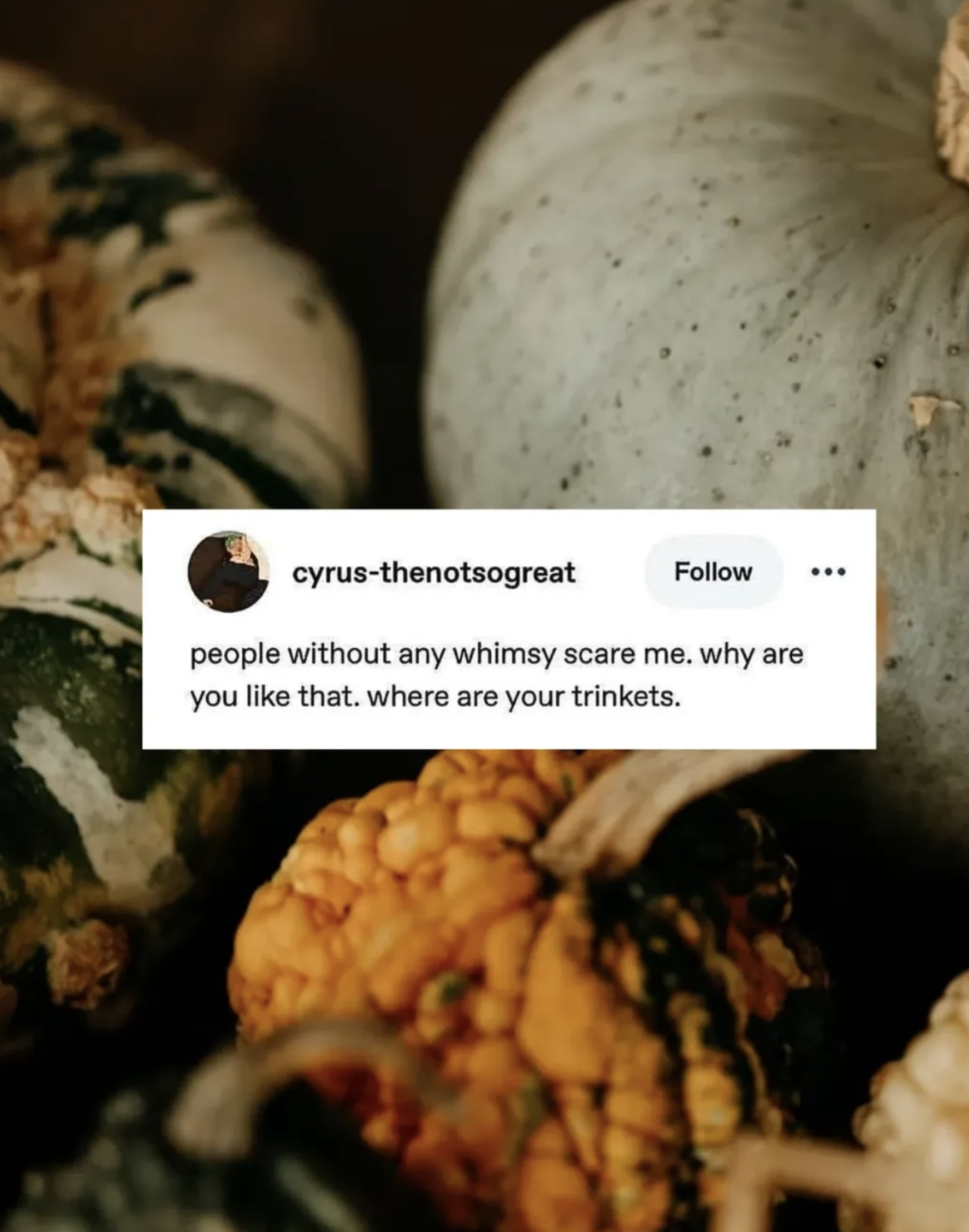 +WHERE IS YOUR WHIMSY?: There is room for all kinds of kinds, but this meme made me laugh. I am always drawn to and delighted by people with unexpected quirks and hobbies — yes, I do want to know about your extensive collection of washi tape!