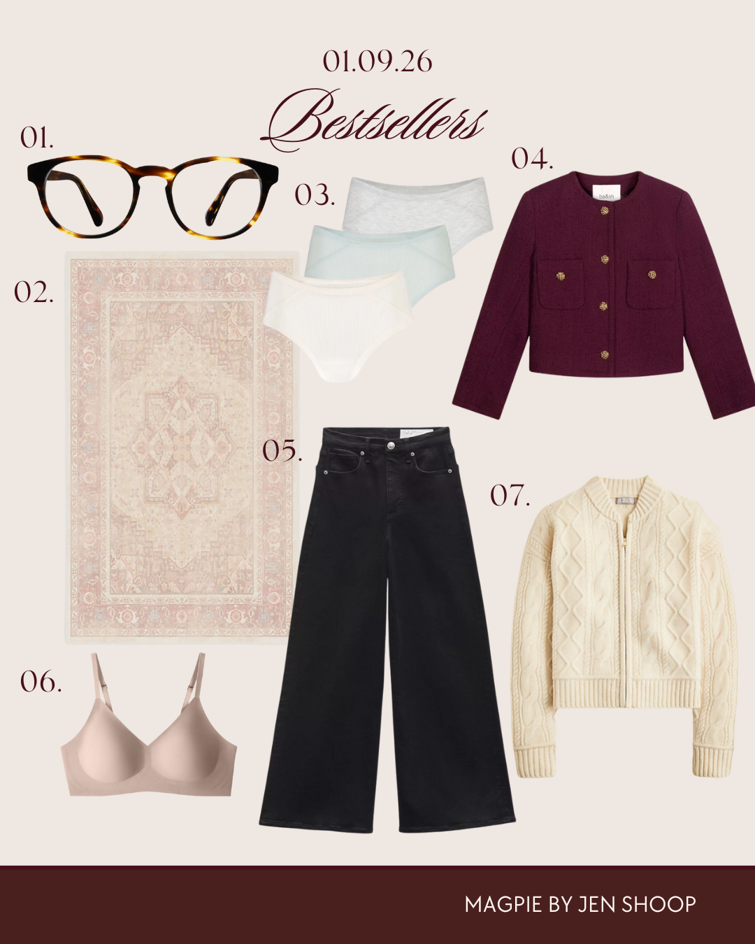 01. WARBY PARKER PERCEY GLASSES // 02. PINK RUG // 03. GUARANTEED TO HELP YOU BUILD A NO-SKIP UNDERWEAR DRAWER // 04. BURGUNDY JACKET BLAZER // 05. RAG AND BONE WIDE LEG JEANS // 06. BEST BRA // 07. CABLEKNIT BOMBER // 08. UNIQLO PUFFER VEST // 09. KNIT DRESS // 10. RAG + BONE REVERSIBLE JACKET