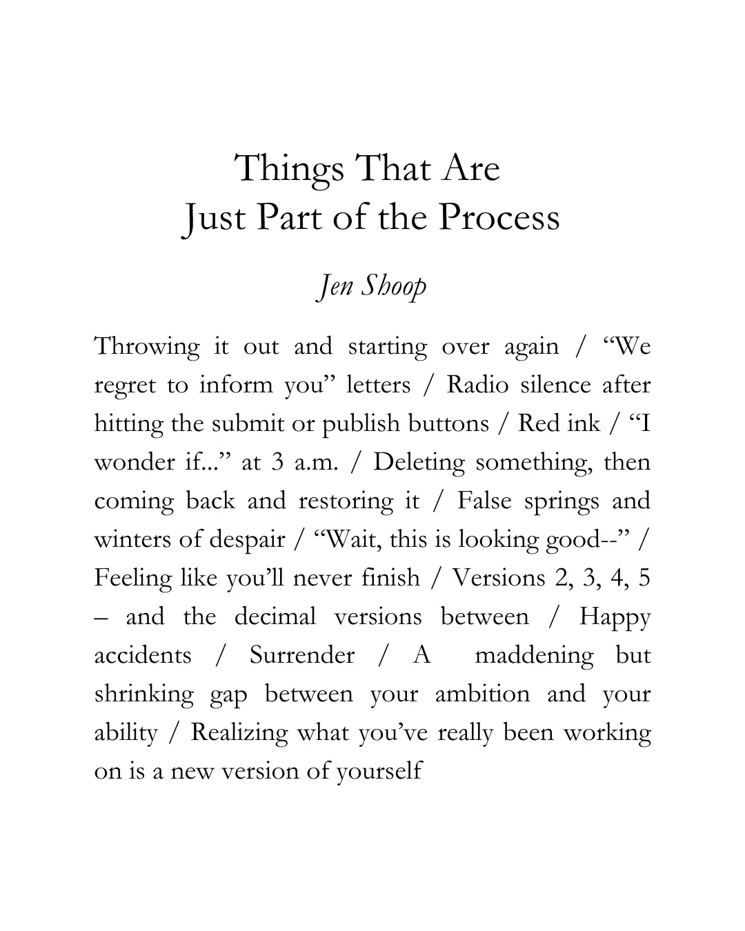 I have the sense-memory of this comment peppered throughout my youthful, striving years, the words often issued by seasoned practitioners who were on the other side of success — ones who meant well but forgot how tender-petaled you are when you carry the cacophonous and mildly dangerous combination of inexperience and ambition. Rejection letters, the crestfalling silence after submitting or publishing something (almost worse, in some ways, than the blunt “We regret to inform you” stock), drafts marked up by ink and the apprehension of your ineptitude. “Oh, it’s just part of the process.” Crushing!