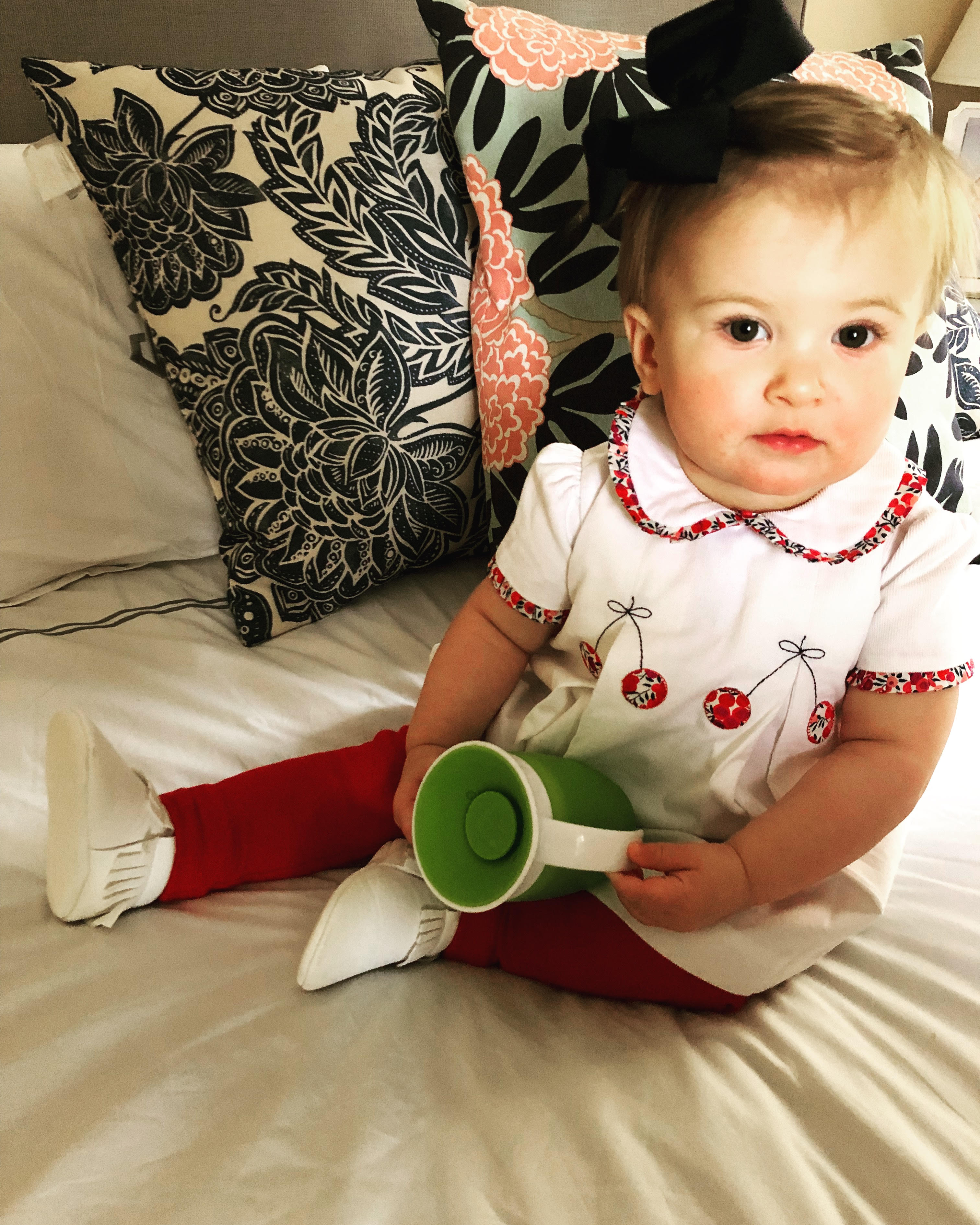 In the snap above, mini’s wearing a top by Marco & Lizzy (you can find a bunch of their darling stuff here — how sweet is this?!), leggings from Primary, mocs from Sweet N Swag, and — of course — a bow from PoppyBows (she wears 4″ bows). Also present: the uber chic accessory of the season, this Miracle 360 cup, the first drinking vesicle she actually used! (We’d tried like five others before and she didn’t get them.)