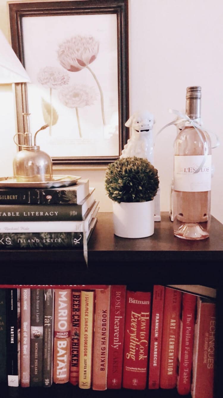 I brought my first bottle of rose of the season to the playdate and it made me very very excited about things to come. This little snap of one of the bookcases in my home brings me so much joy — it’s a poorly-lit, blurry picture, but it contains so many of my favorite things: a brass plant mister I bought from Jayson Home (a stunning furniture/home decor store in Chicago) back when I lived just a short walk from it in Lincoln Park; a happy little boxwood; and many of our favorite, well-worn, dog-eared and oil-splatted cookbooks.