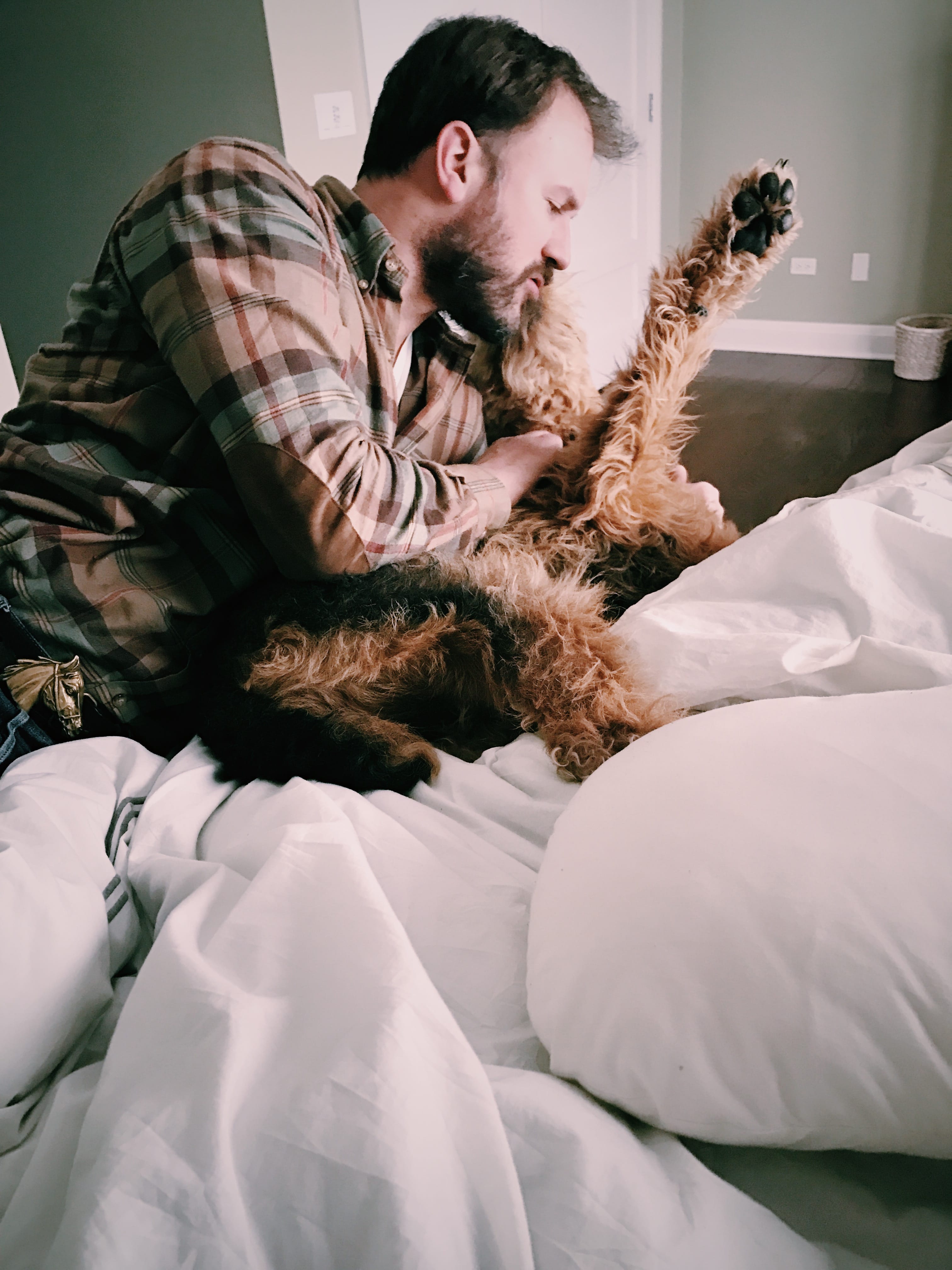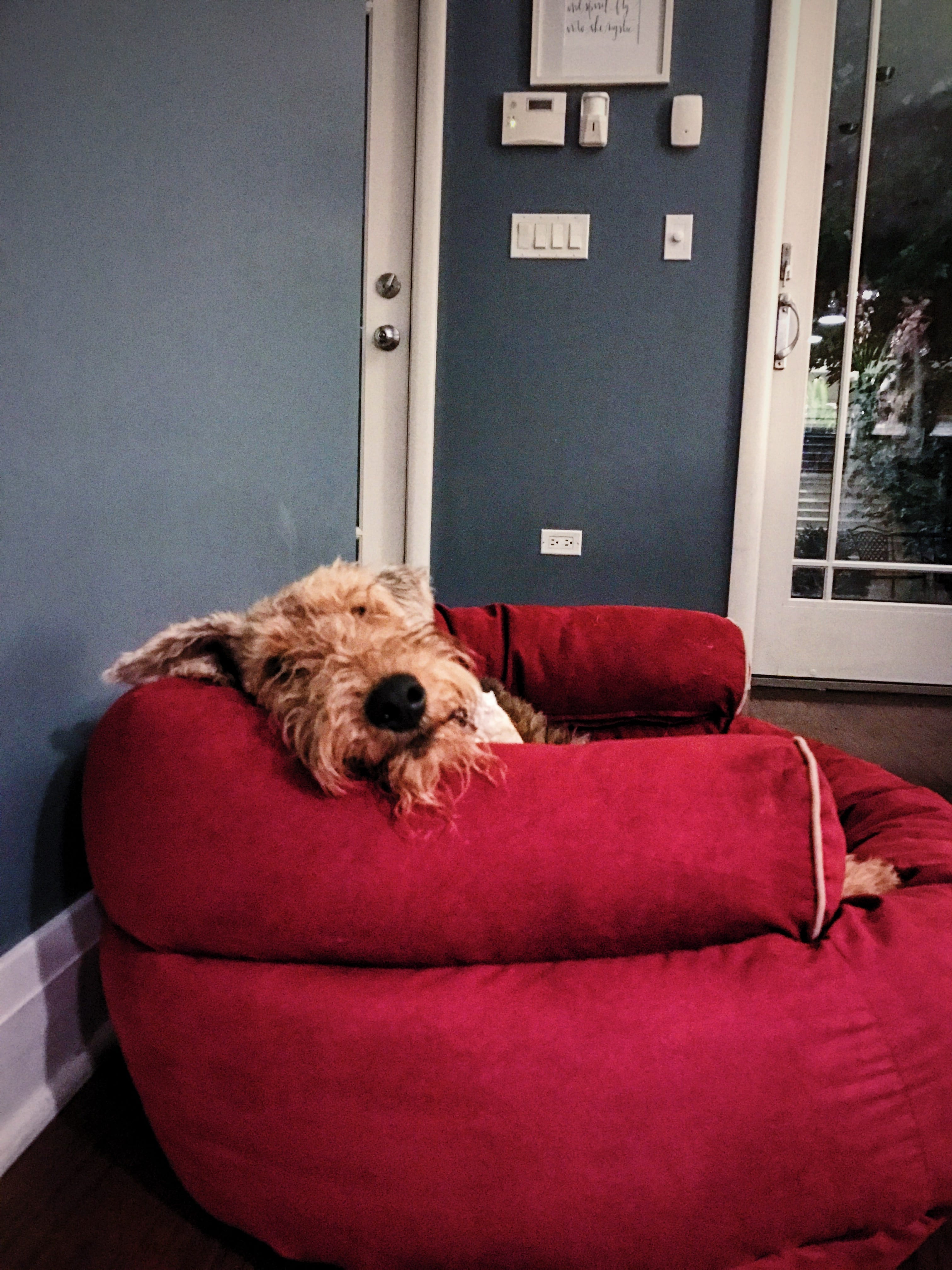 Tilly is now a year and four months old, and very much in puppy mode.  She is simultaneously the terror and light of our lives.  She is endlessly frustrating (within the past 24 hours, she has shredded a meaningful card from mother-in-law; snagged a pair of #minimagpie’s shoes off the counter, requiring a long and protracted chase around the house; and eviscerated a pillow), but she makes us laugh every single day–and, like total nut cases, we miss her when we’re away and will often look at pictures of her while we’re in bed, just a floor above where she sleeps.  I will admit that raising a puppy has been harder than I expected, especially given her breed characteristics (Airedales are notoriously high-energy and stubborn) and her size (she’s about 60 lbs, which makes her hard for me to control given my petite stature), but the challenging aspects of her personality are also what make her so damn perfect for us: we love her intelligence, sassiness, independence, and bravery.  I regret that she doesn’t have more space to run around; we’d love to give her a big farm yard in which to chase rabbits and rodents–it’s where she’s meant to be, what she’s meant to do!–but we do have a small backyard that she dominates (it’s her turf) and make an effort to take her up to the dog park typically 4-5 times a week.