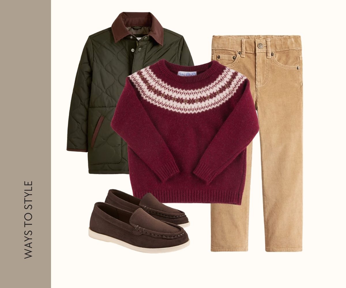Fall is probably my favorite season for styling little boys. The knits! The cords! The little striped tees and chore jackets! Gah. Above: one of my favorite photos of Hill, two years ago, wearing a fair isle duck sweater that Little English still releases in different colors each year. Adorable. I have zero regrets about dressing my kids like little dolls for the first four years of their lives. I look back at old photos of them via my Aura digital frame (which we keep in our kitchen, and which LOVE — I am constantly pausing what I’m doing and getting lost in the happiest memories!) and think: “I’m so glad you did that.” Ha. It just brings me so much joy to see their tiny faces in the cutest little clothes! Fast forward to now, when Emory has an exacting eye and prefers baggy hoodies every day of the week and twice on Tuesday. I love this for her, and am supporting her sartorial preferences fully, but I do miss the days of smocked dresses and hairbows…