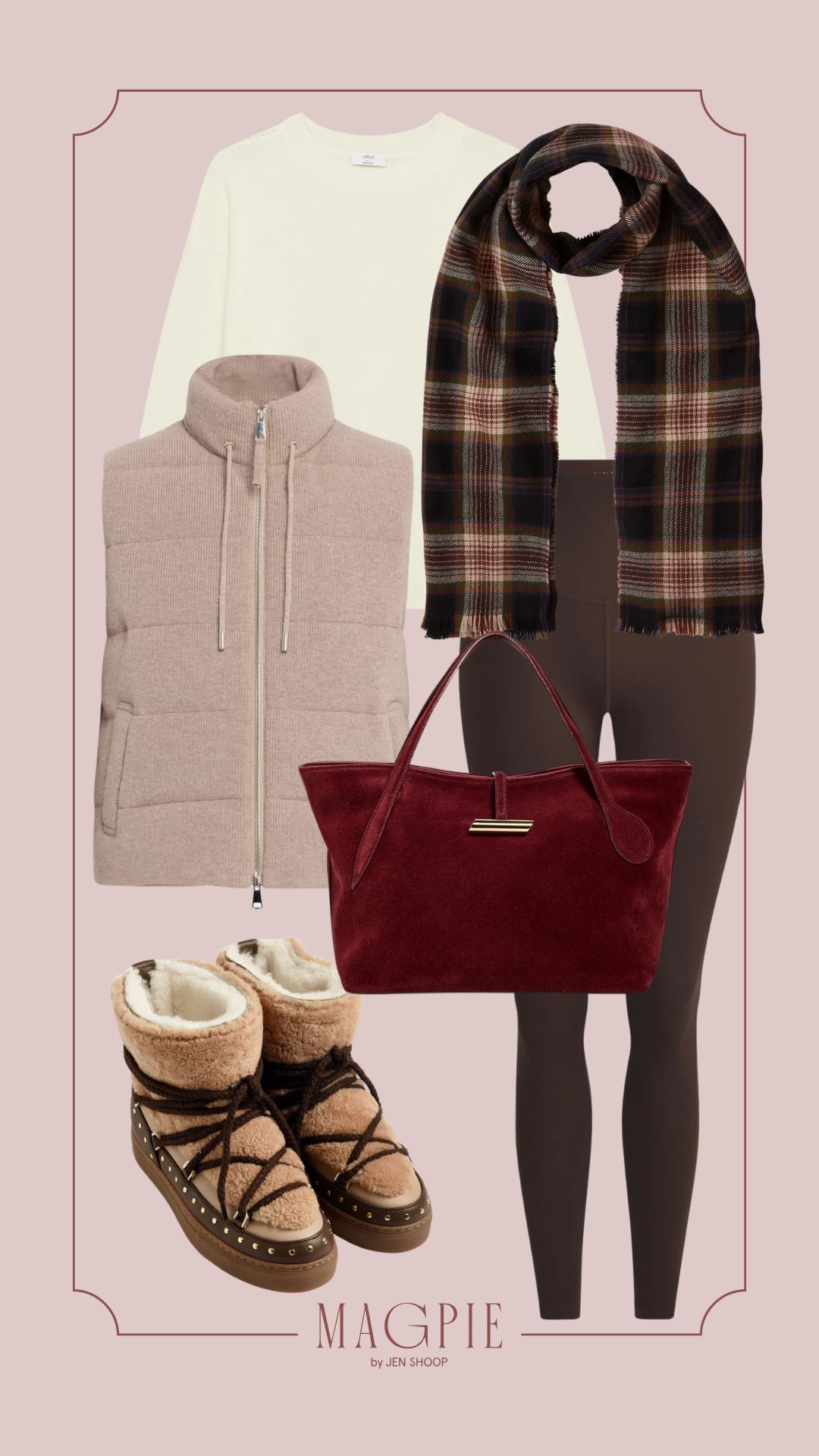 FREESOFT LEGGINGS // ISABELLE WOOL SWEATER // PLAID WOOL SCARF // PETITE PENNE TOTE SUEDE BAG // CURLY ROCK BOOT // CASHMERE PUFFER VEST (LOOK FOR LESS HERE)
