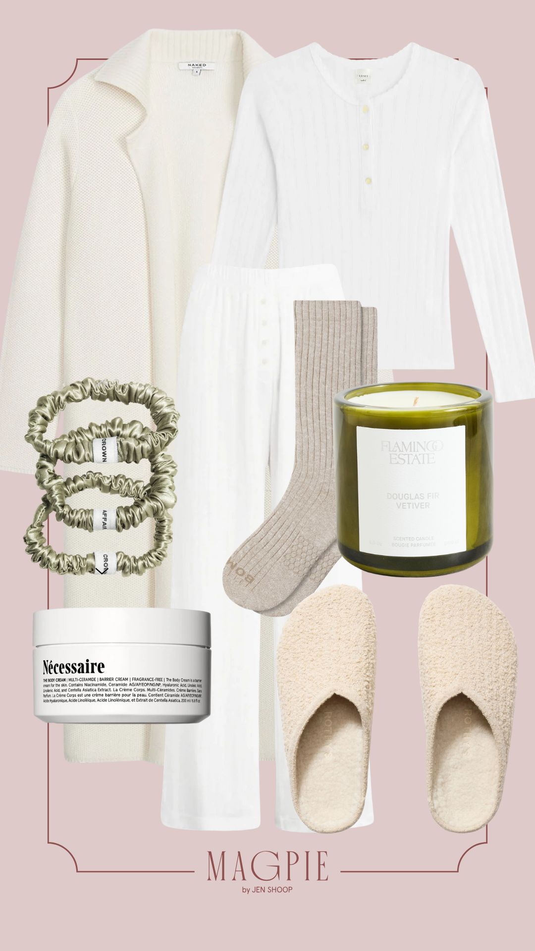 POINTELLE LONG SLEEVE // POINTELLE BOXER PANT // DARYA CASHMERE CARDIGAN // THE COZY CLOG // THE BODY CREAM // LODGE SOCKS // THE SCRUNCHIE // DOUGLAS FIR AND ANCIENT VETIVER CANDLE