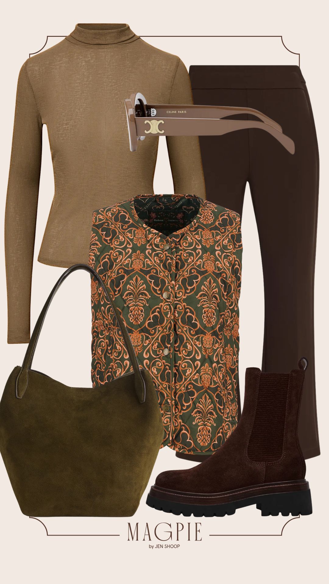 GREEN FERNANDA LINER VEST // WYETH KNIT TURTLENECK // MACKENZIE STRAIGHT LEG PANTS // BLITZEN PLATFORM CHELSEA BOOT // SHOPPER TOTE // CELINE SUNGLASSES