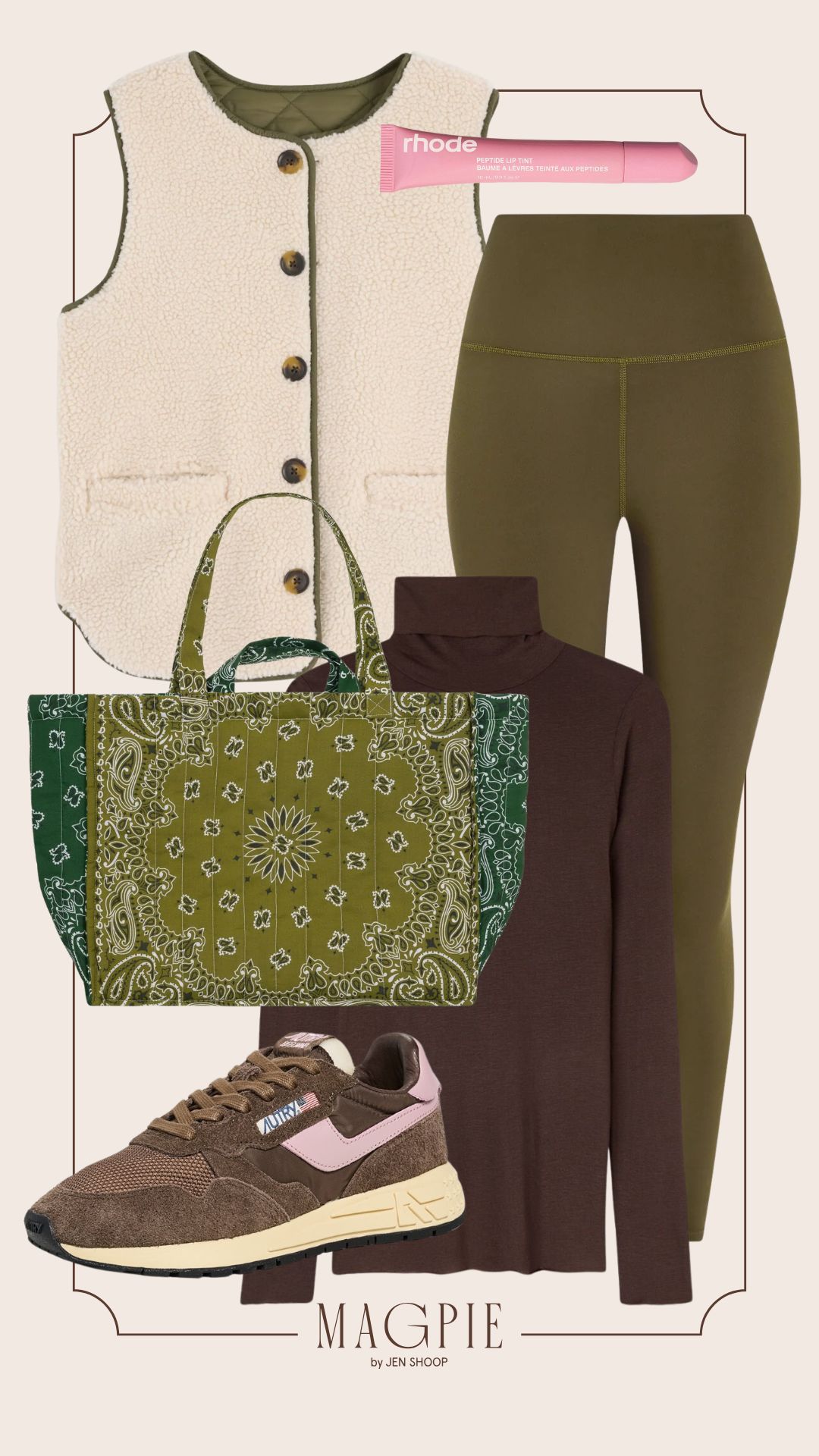 CLERKENWELL REVERSIBLE VEST // FREESOFT LEGGINGS // ULTRALIGHT HIGH NECK TOP // REELWIND SNEAKERS // CALL IT BY YOUR NAME TOTE // RHODE LIP GLOSS