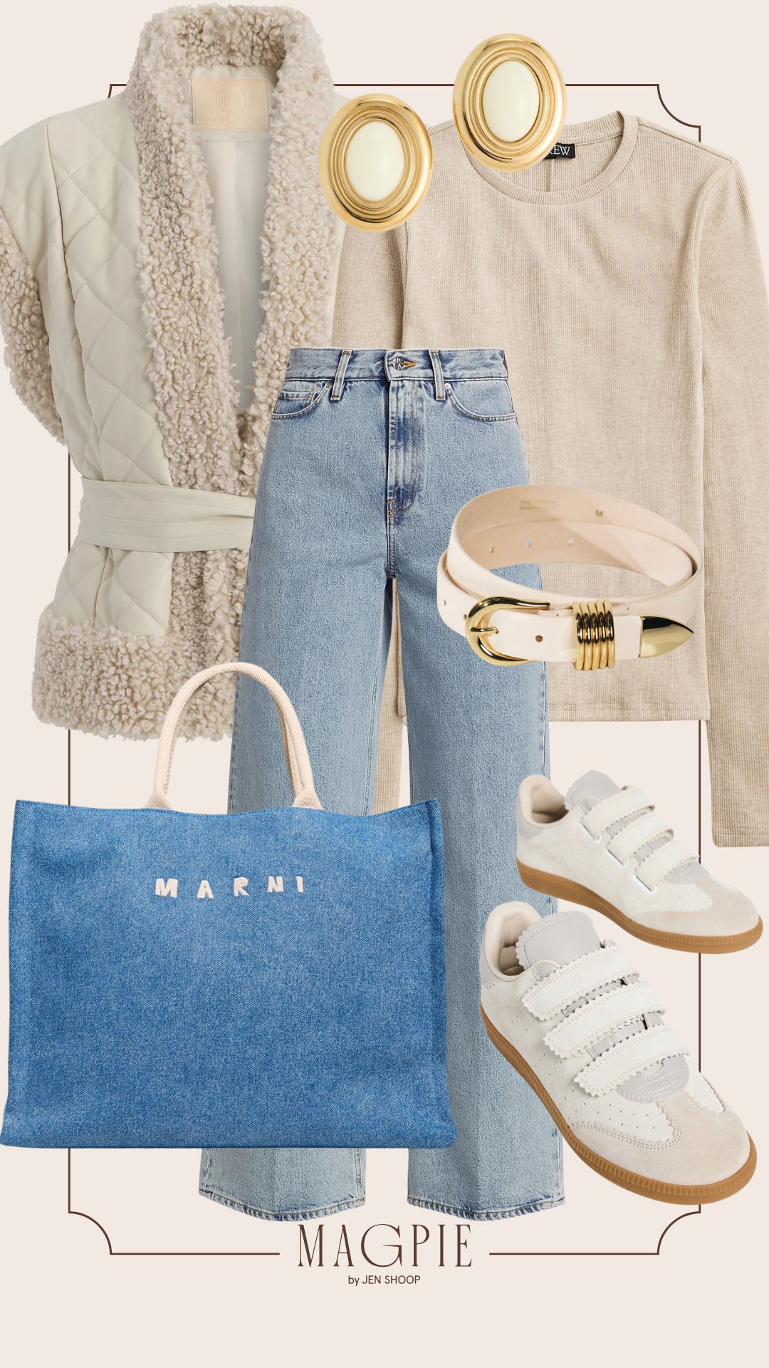BEATRICE VEST // HIGH RISE WIDE LEG JEANS // THE PERFECT RIBBED LONG SLEEVE T SHIRT // BETH SNEAKER // LARGE BASKET BAG // HOLLYHOCK BELT // PRIZE EARRINGS