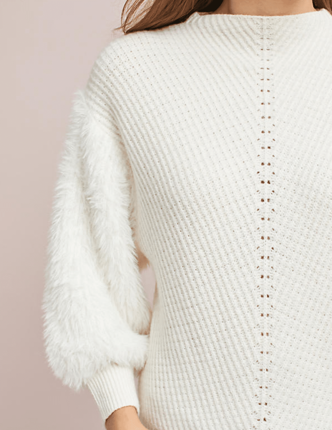 Ganni Sweater, $475 — available in gray here // Velvet + pom heels, $130 // Shearling pouch, $30 // Fringe-sleeved sweater, $59 // Shearling circle ring handled bag, $395 // Ganni boucle jacket, $350 // Loeffler Randall shearling bag, $495 // Ferragamo fur flats, $560 // Alexandre Birman fur trim heels, $695 // Sheep-print pom heel, $130 // Fur circle ring handled bag, $395 // Faux fur trim jacket, $149 // Faux fur cylinder bag, $340