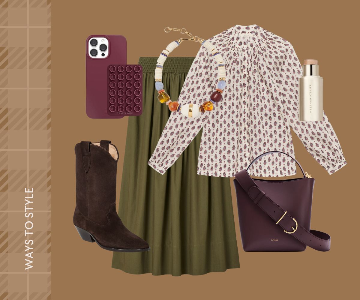 PHONE CASE // PHONE GRIP // POPLIN SKIRT // DOEN TOP // WESTMAN ATELIER HIGHLIGHTER // ISABEL MARANT WESTERN BOOTS // BUCKET BAG // NECKLACE
