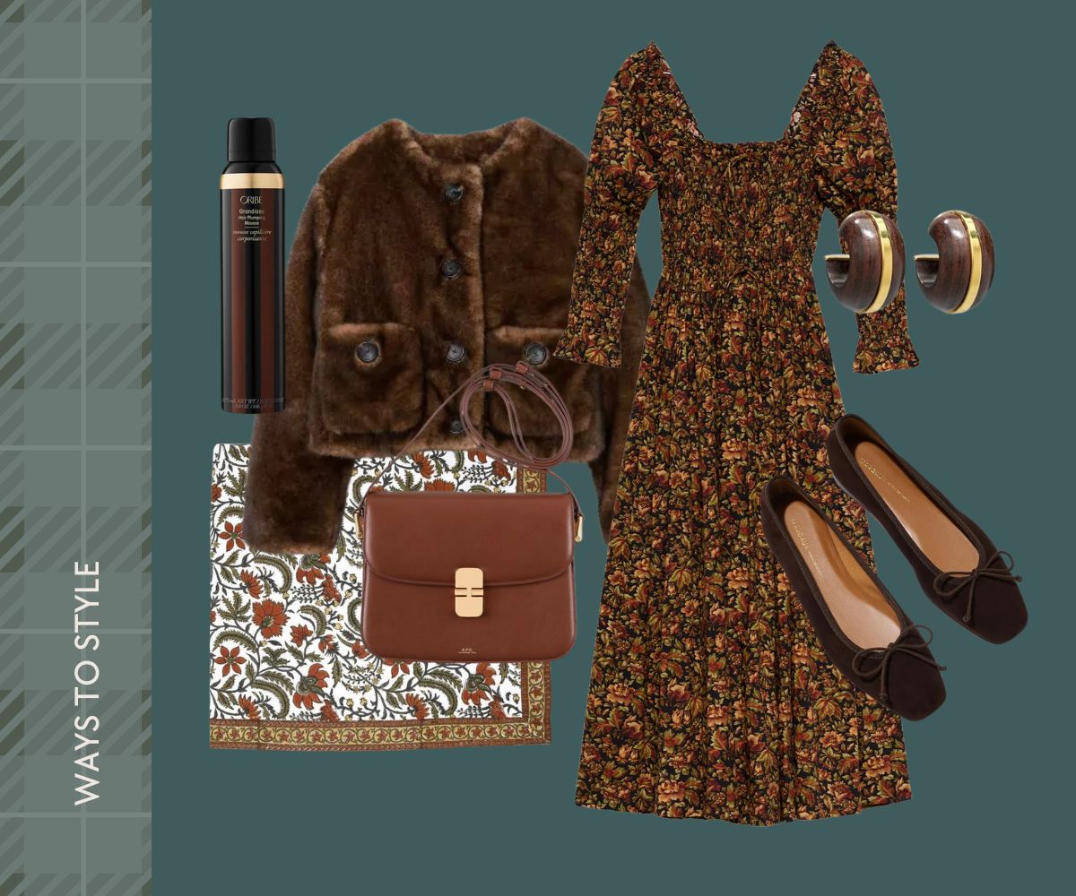 DOEN DRESS // FAUX FUR COAT // TABLECLOTH // MARGAUX FLATS // EARRINGS // ORIBE PLUMPING MOUSSE // CROSSBODY BAG
