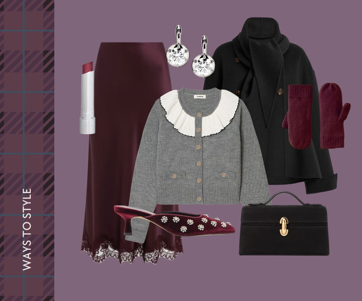 SLIP SKIRT // SANDRO CARDIGAN // COAT // SAVETTE CLUTCH // VELVET MULES // LIP BALM // MITTENS // EARRINGS