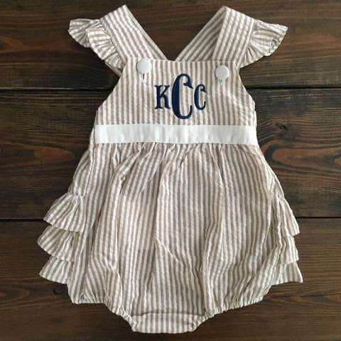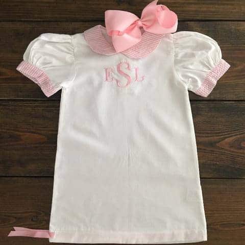 My FAVORITE source for monogrammed baby goods is The Bella Bean — gorgeous, classic pieces with affordable personalization. Â I love these jon jons for boys ($30), this seersucker ruffled bubble ($30), and especially this daygown ($32), which the sweet ladies behind this store–Marisa and Kelly–very generously gifted me.