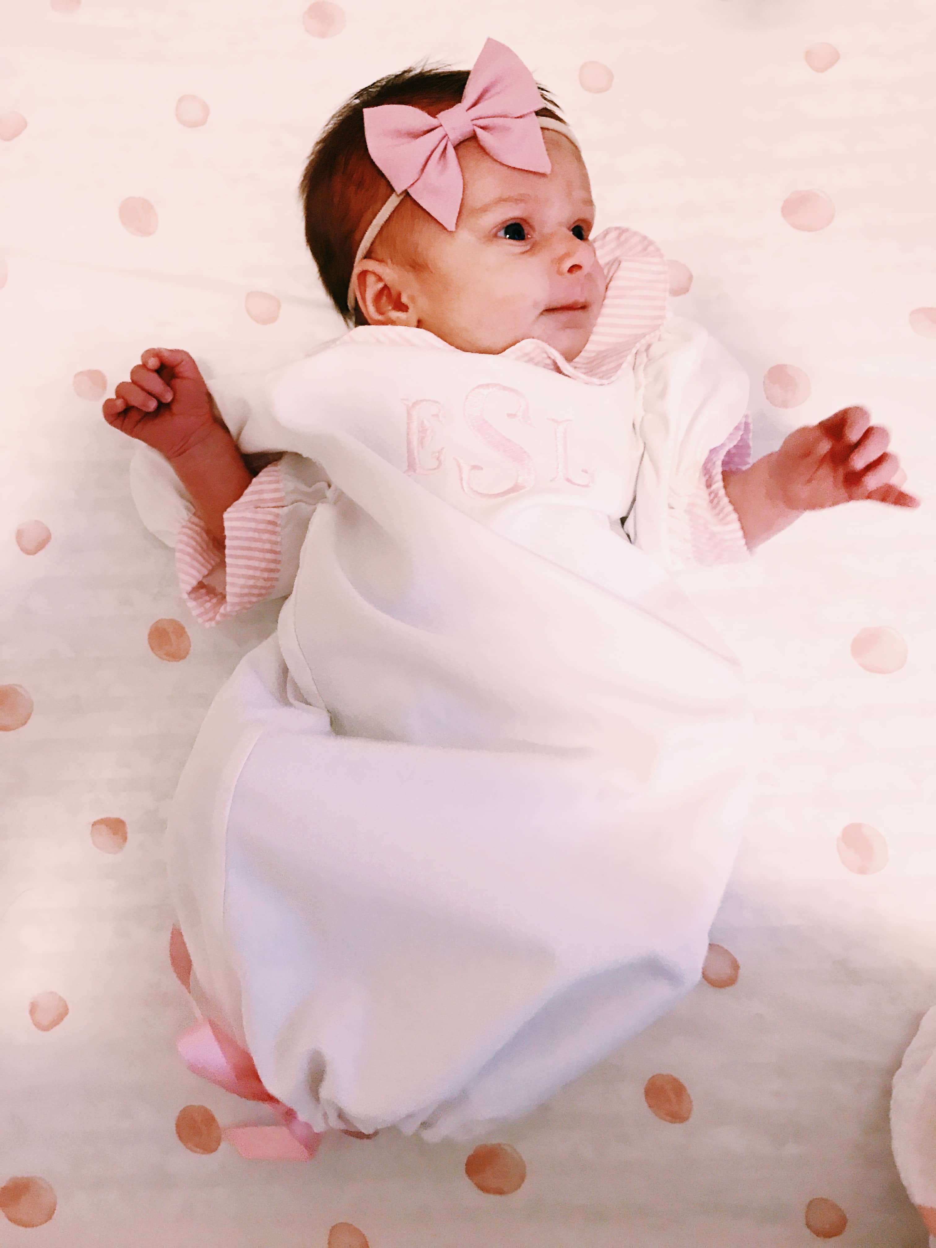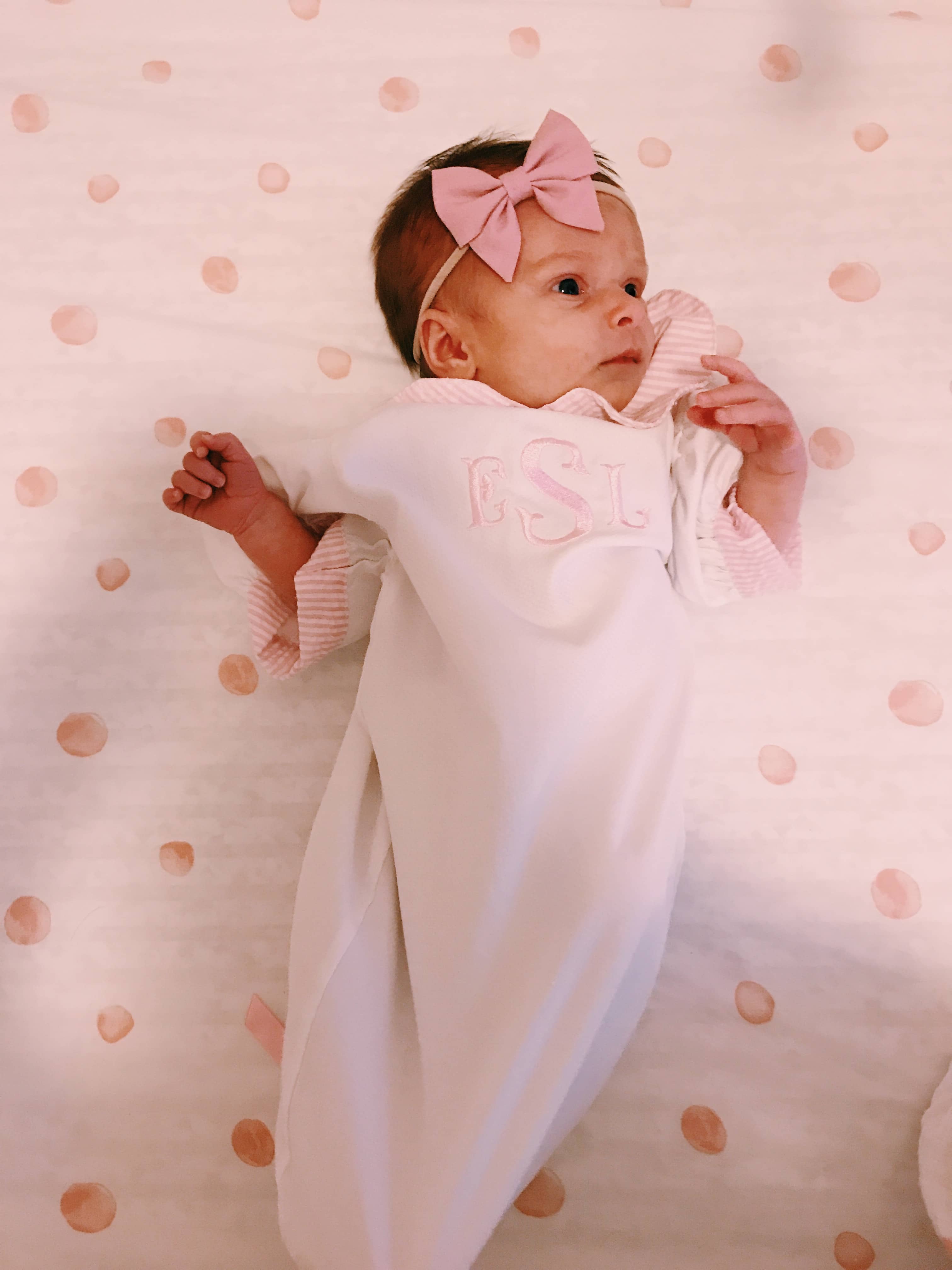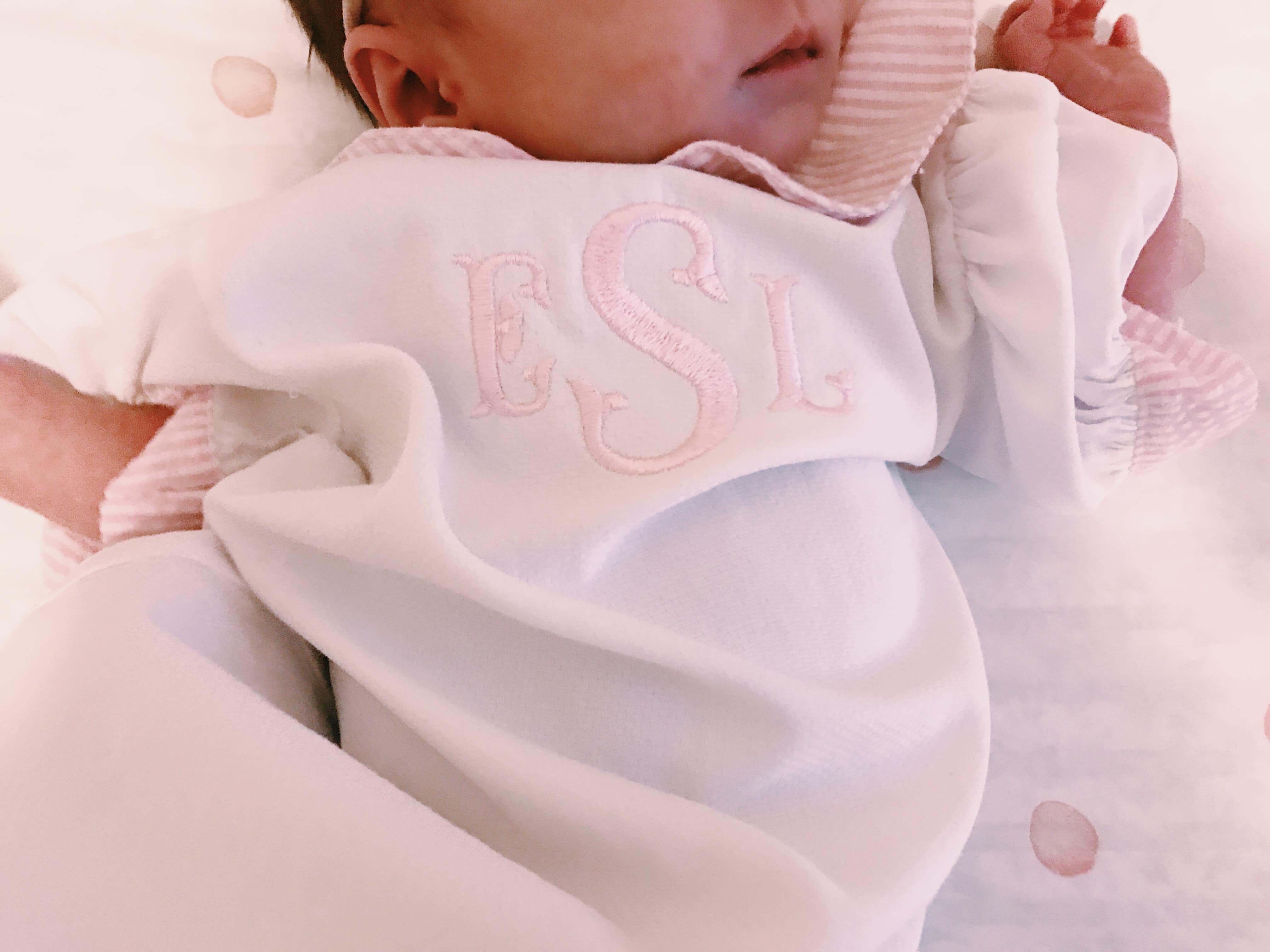 After mini was born, I received a number of personalized blankets, articles of clothing, and burp cloths (loveee these, a gift from my sweet sister).  Something so special about receiving new goodies with your babe’s newly-minted name on it.  (Also, three weeks in, I still sometimes I stop and think, “Wait a minute.  I made a baby.  And I named her.  Like, there’s a human being in this world with a name I gave her.  And I made her.”  It literally blows my mind.  #Basicthoughts.  Moms: does this ever wear off?!  I’m literally astounded by this.)