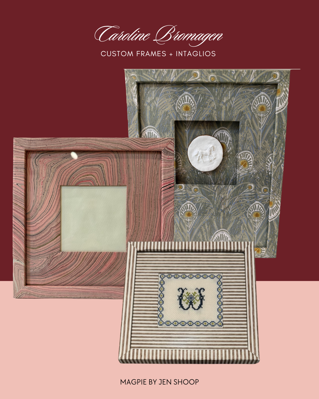 Caroline is an artist and mother who decided, at the dawn of 2025, to take her passion to the next level. She wrote: “I made it my 2025 goal to be creative every day and I have seriously committed to it.” For years, she has been cross-stitching, making custom intaglios, and crafting frames for objets and photos for friends, using wallpaper, marbleized paper, paint, “or anything that catches my eye to wrap the frame” — true Magpie energy there! (Magpies are drawn to shiny objects!). When Caroline reached out earlier this fall, she commented: “We went to Ireland last month and while there I decided that I wanted to try to sell my frames. When we got home from our trip, I made several frames so that I could have something to list on Etsy.”