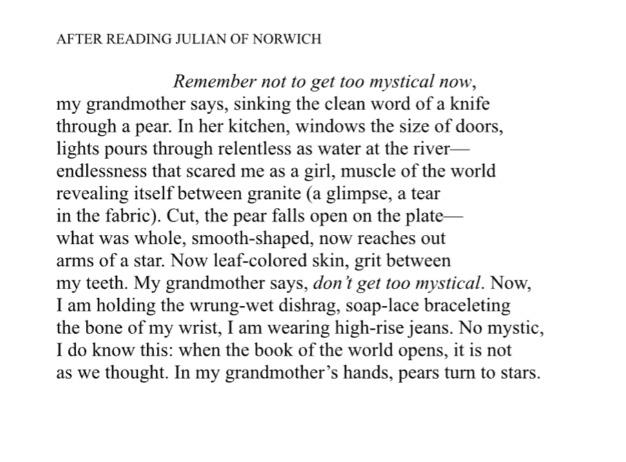Sophia shared with me a small anthology of her beautiful poetry, noting “I love that the root of the word anthology means “a gathering of flowers” — think of this as a little bouquet of the Magpie universe!” She also observed: “Poetry, to me, feels like a way of finding the human texture in the blur of daily life, and dwelling there, lingering a little longer.” I especially loved the poem below, which brought to mind Elizabeth Bishop’s “Sestina,” one of our canonical Magpie texts, with its evocative portrait of a moment of quiet domesticity and the universes it can contain.