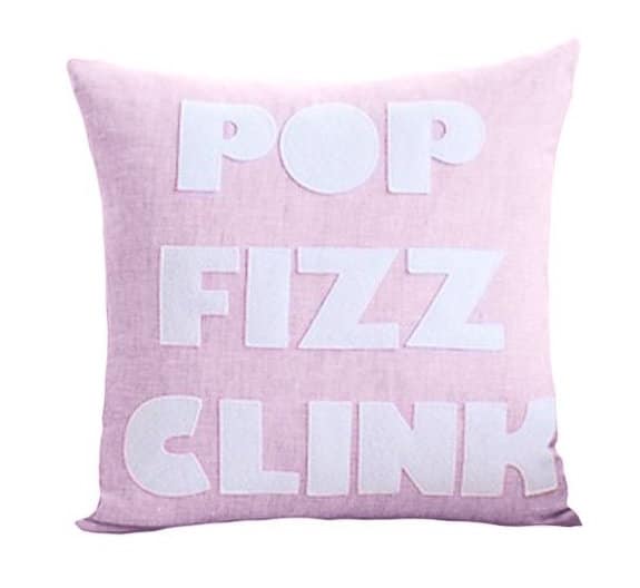 The cheekiest little pillows ($97 for Pop Fizz Clink; $64 for XOXO) from Etsy storefront Alexandra Ferguson. Also love this one, and these customizable zip code ones are kinda fun, too.