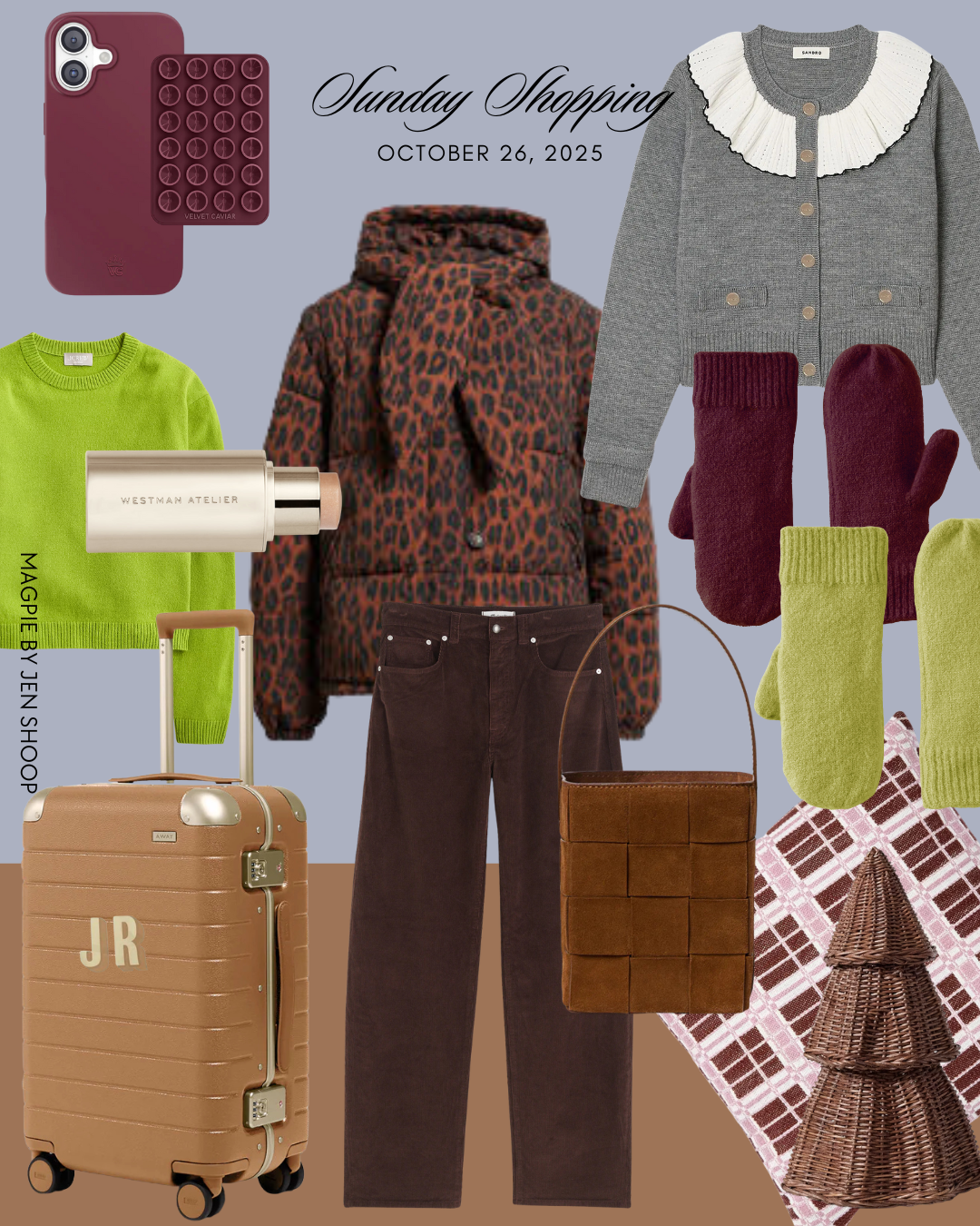 BURGUNDY PHONE CASE AND MAGSAFE MOUNT // KIWI CASHMERE SWEATER (20% OFF) // LEOPARD PUFFER // WESTMAN ATELIER LIT STICK (NEW COLOR FOR HOLIDAY!) // AWAY SUITCASE WITH STICK ON INITIALS // CHOCOLATE BROWN CORDS // SANDRO COLLARED CARDIGAN // MITTENS IN THE BEST COLORS // WOVEN BUCKET BAG (30% OFF) // TARGET PILLOW // TARGET WICKER TREES