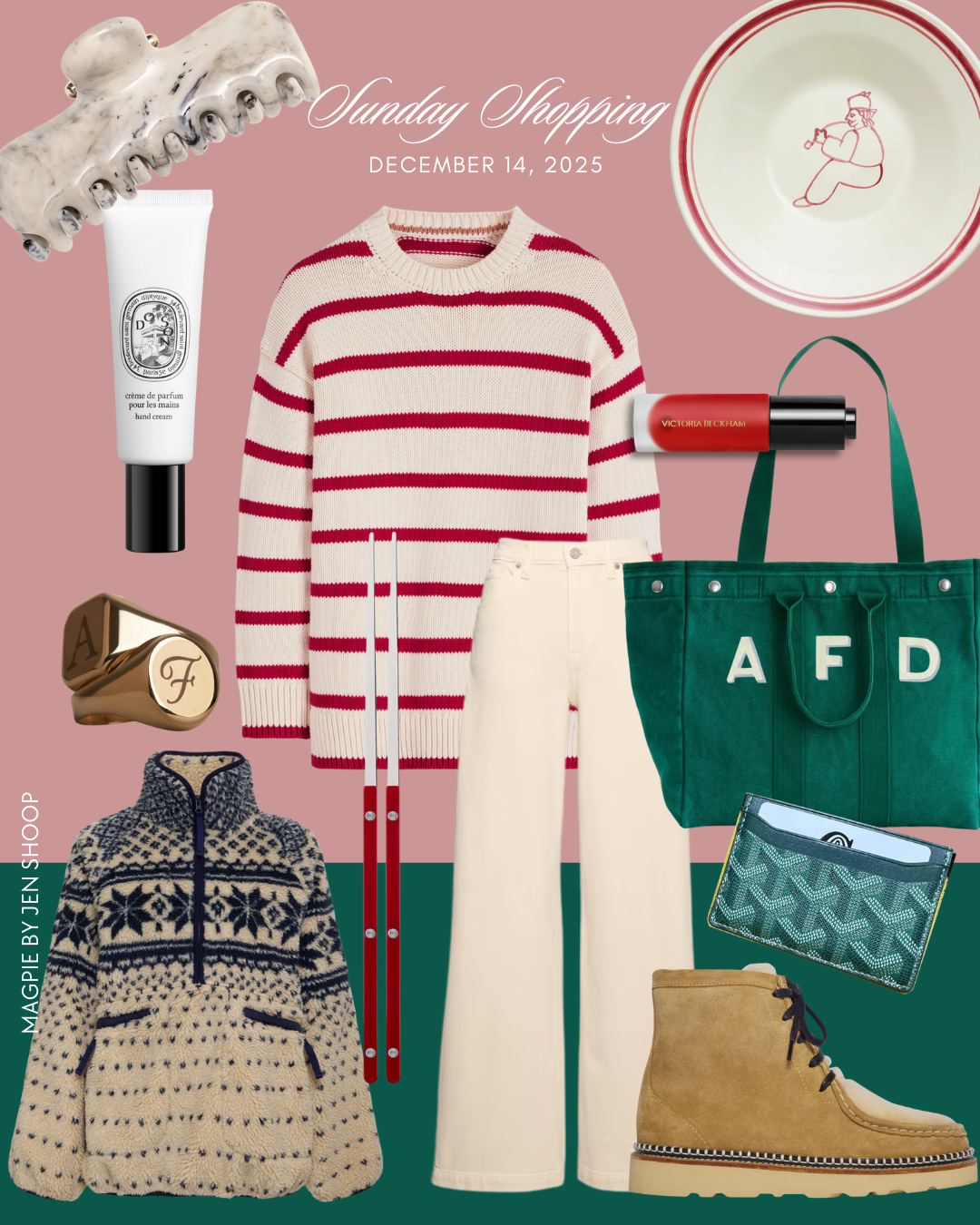 UNDO HAIR CLIP // DIPTYQUE HAND BALM // AURATE SIGNET RINGS // BODEN SWEATER // GAP JEANS // SABRE CHOPSTICKS // SNOWFLAKE FLEECE // PORTA HAND-PAINTED PASTA BOWLS // VICTORIA BECKHAM COLOUR WASH // ALEX MILL TOTE // GOYARD INSPIRED CARD CASE // FREDA SALVADOR WINNIE BOOT