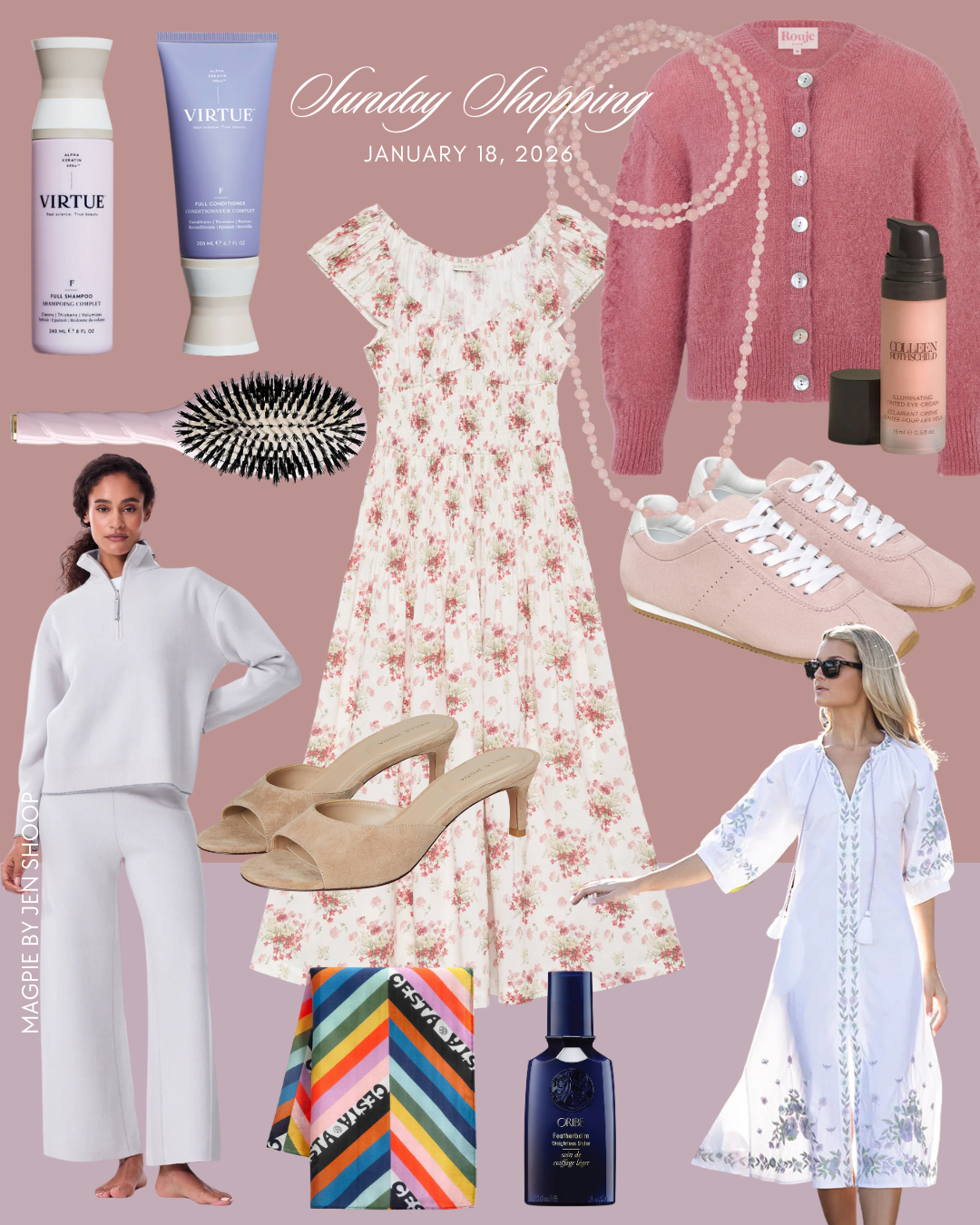 VIRTUE LABS SHAMPOO AND CONDITIONER // LA BONNE BROSSE BRUSH // DOEN DRESS // SUEDE MULES // JENNIFER BEHR NECKLACE // ROUJE PINK SWEATER // COLLEEN ROTHSCHILD EYE CREAM // M. GEMI SNEAKERS // ALICE WALK LOUNGE SET // CESTA PAREO // ORIBE FEATHERBALM WEIGHTLESS STYLING CREAM // JULIA AMORY X AERIN CAFTAN