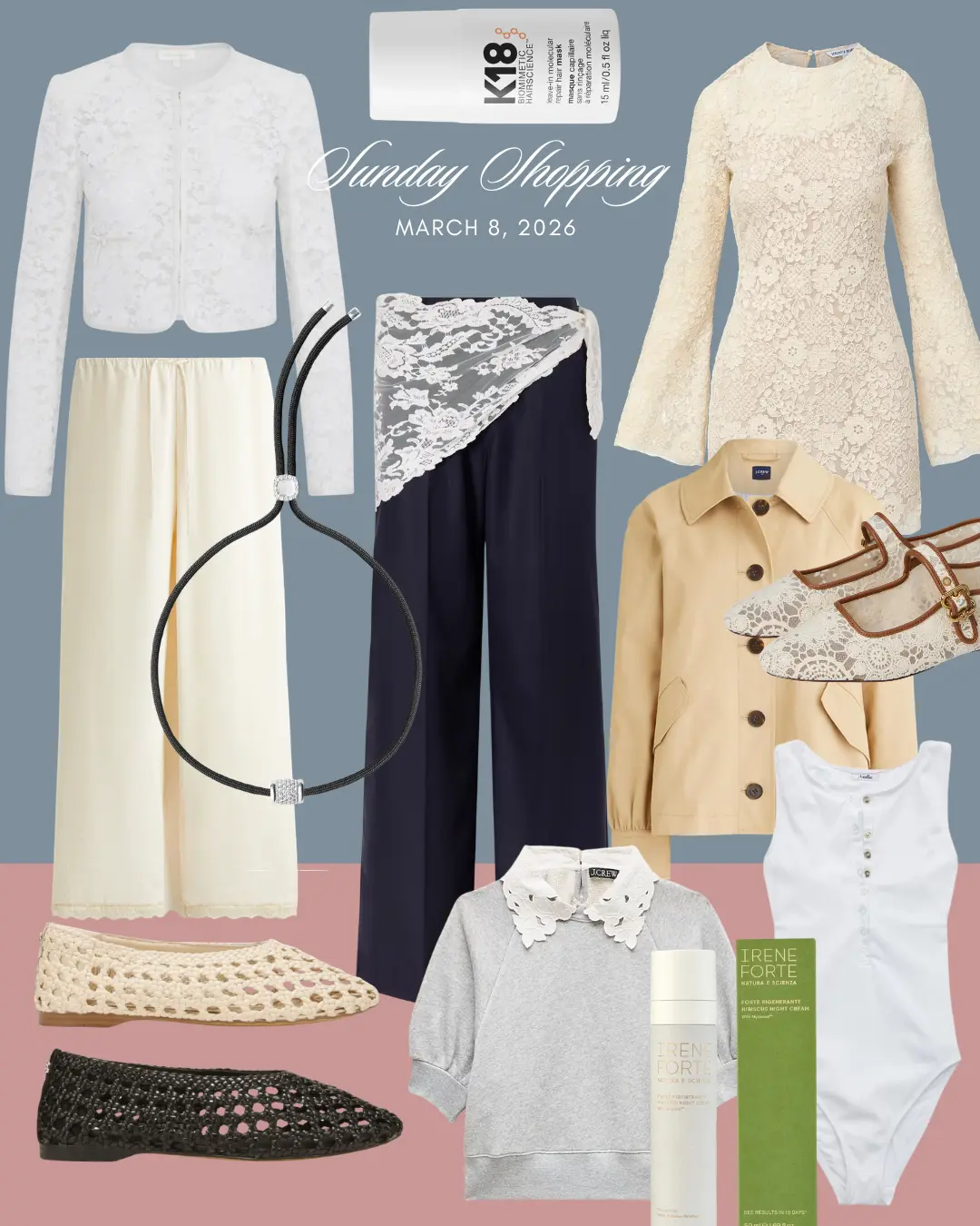 LACE BLAZER // H&M LACE TRIM PANTS // K18 MOLECULAR REPAIR HAIR MASK // SEA FIORE PANTS // DORSEY PARACORD NECKLACE // KNOTTED FLATS // VERONICA BEARD DRESS // CROPPED TRENCH COAT // LACE MARY JANES // J. CREW SWEATSHIRT // ANDIE MALIBU ONE-PIECE SWIMSUIT // IRENE FORTE HIBISCUS NIGHT CREAM