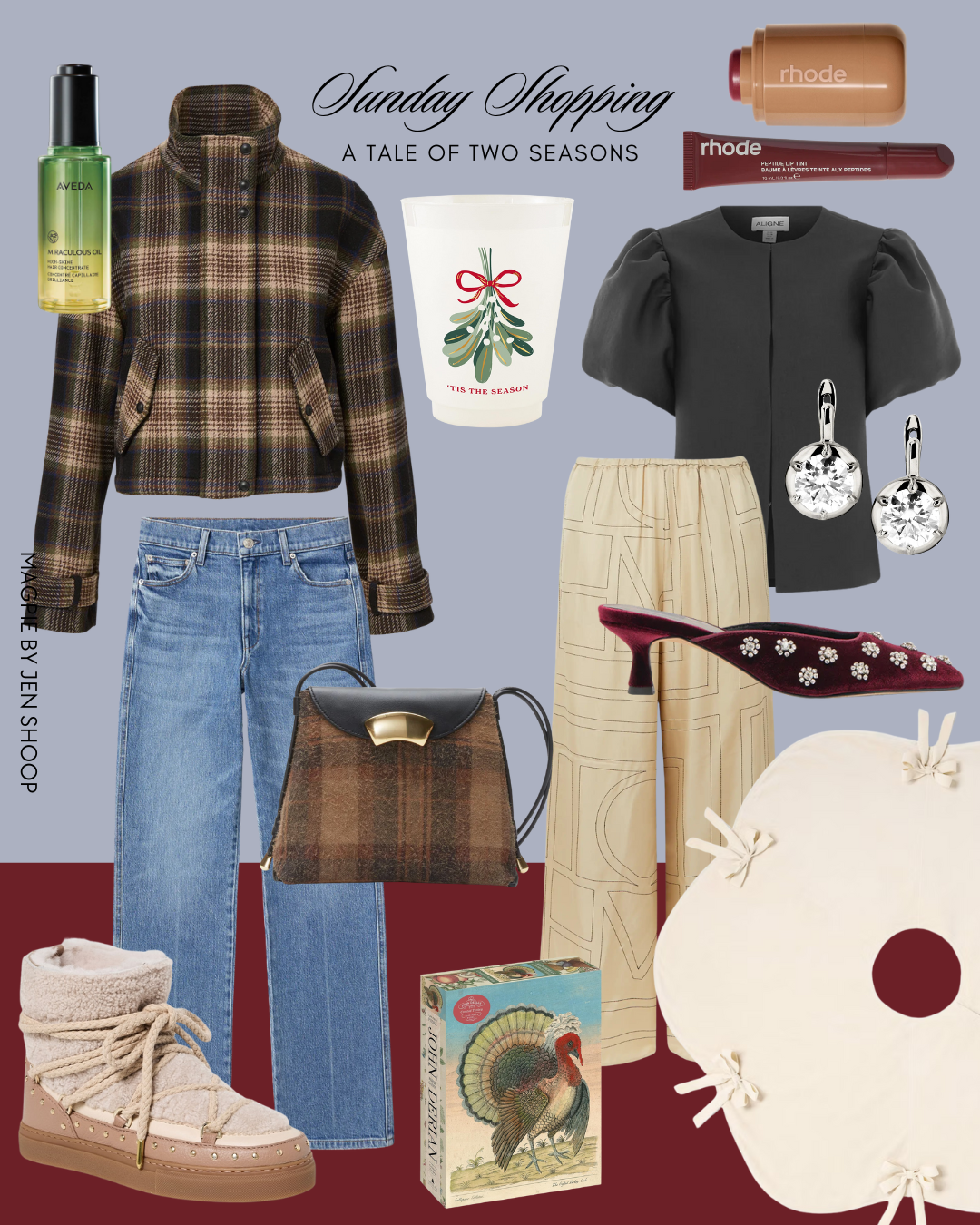 AVEDA HIGH-SHINE HAIR OIL // VERONICA BEARD PLAID JACKET (VIBE FOR LESS HERE, HERE) // AYR LEGEND JEANS // A GREAT HOSTESS GIFT FOR THE SEASON AHEAD // PHILLIP LIM BAG // INUIKII BOOTS // RHODE CREAM BLUSH AND LIP GLAZE // ALIGNE TOP // TOTEME PANTS // DOLCE VITA MULES // DORSEY EARRINGS // TURKEY PUZZLE // TREE SKIRT