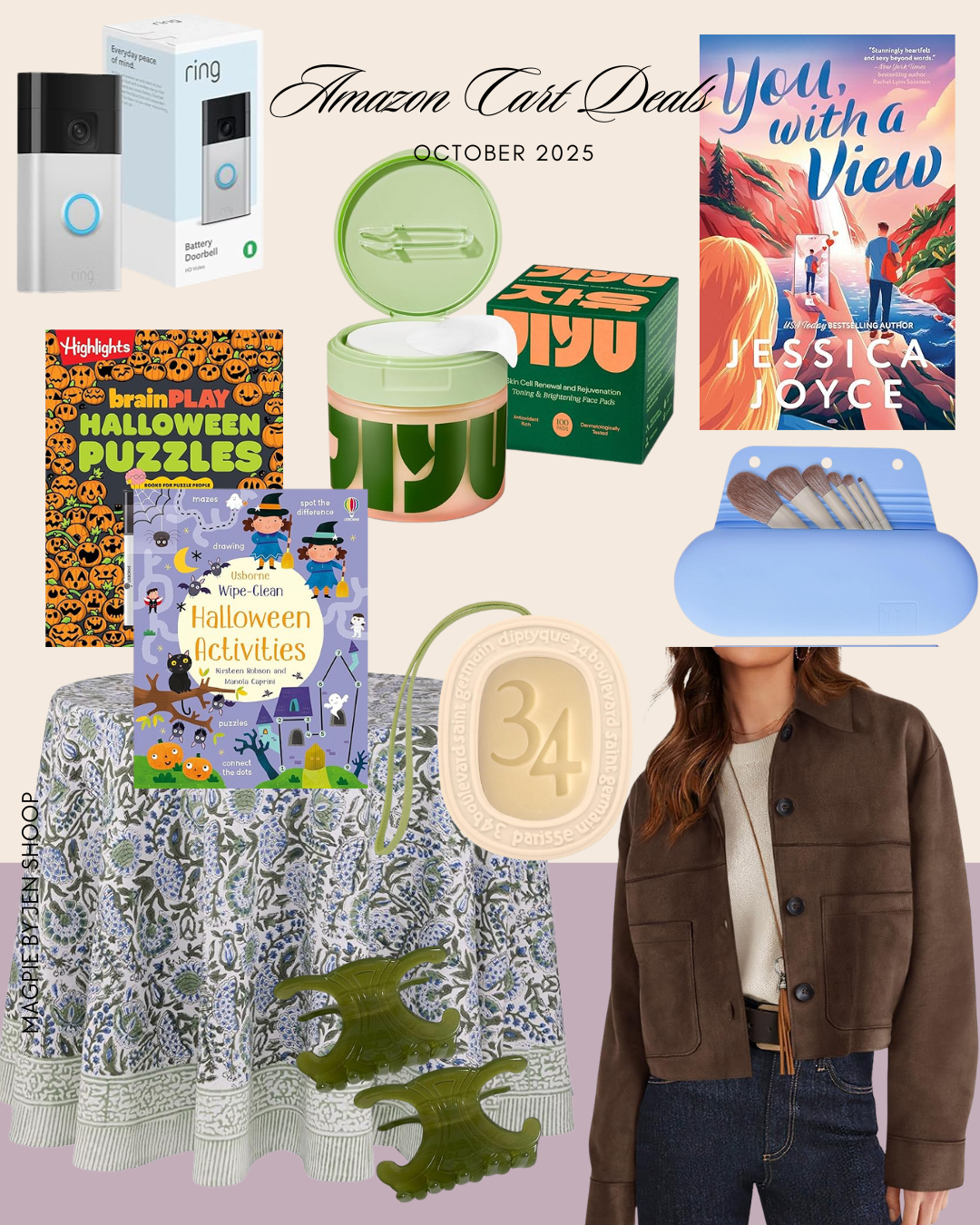 RING DOORBELL // HIGHLIGHTS HALLOWEEN PUZZLES // USBORNE HALLOWEEN WIPE-CLEAN ACTIVITY BOOK // BLOCKPRINT TABLECLOTH // KOREAN SKINCARE BRIGHTENING PADS // DIPTYQUE SCENTED OVAL // CELINE-INSPIRED HAIR CLIPS // YOU WITH A VIEW // MAKEUP BRUSH CASE // FAUX-SUEDE JACKET