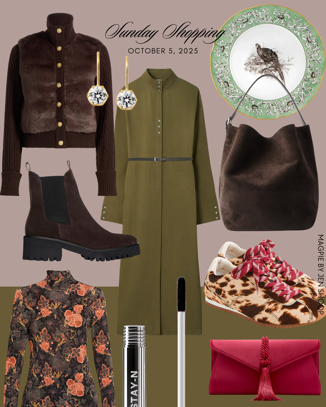 A few chocolate brown pieces to drool over: this Cara Cara jacket (20% off!), this spectacular suede bucket bag from Toteme (GREAT look for less here), and these painted calf-hair sneaks (40% off). The laces are so unexpected and delightful!