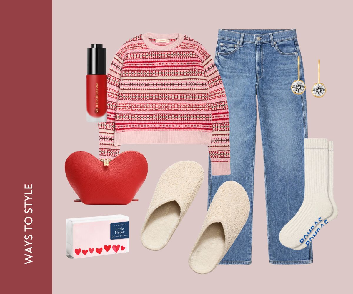 FAIR ISLE SWEATER // CUYANA HEART CASE // ROTHY’S CLOGS // BOMBAS // MINI NOTECARDS // EVERYDAY JEANS // BLUSH TINT // EARRINGS