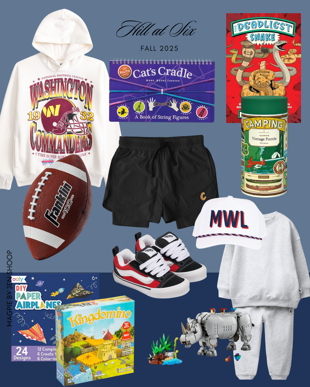 COMMANDERS SWEATSHIRT // CAT’S CRADLE KLUTZ BOOK // DEADLIEST SNAKE BOOK // 1000 PC PUZZLE // FRANKLIN FOOTBALL // CADETS CARDIO SHORTS // CECIL AND LOU MONOGRAM HAT // VANS SNEAKERS // ZARA SWEATSUIT // PAPER AIRPLANE KIT // KINGDOMINO GAME // LEGO CREATOR SET