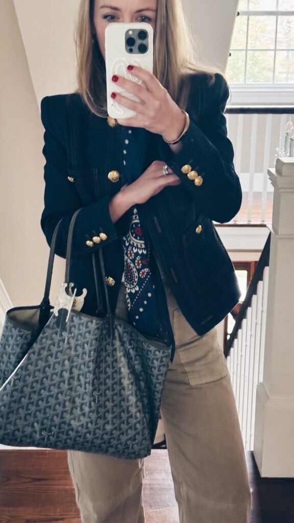 VERONICA BEARD DENIM BLAZER (OLD, SIMILAR HERE; LOOK FOR LESS HERE) // VELVET BY GRAHAM SPENCER BRYLIE BARREL PANTS (BEST UTILITY PANTS FOR PETITES – RUN TTS) // CHANEL BALLET FLATS (SIMILAR HERE, LOOK FOR LESS HERE AND HERE) // MAISON LECOMTE SCARF // GOYARD TOTE