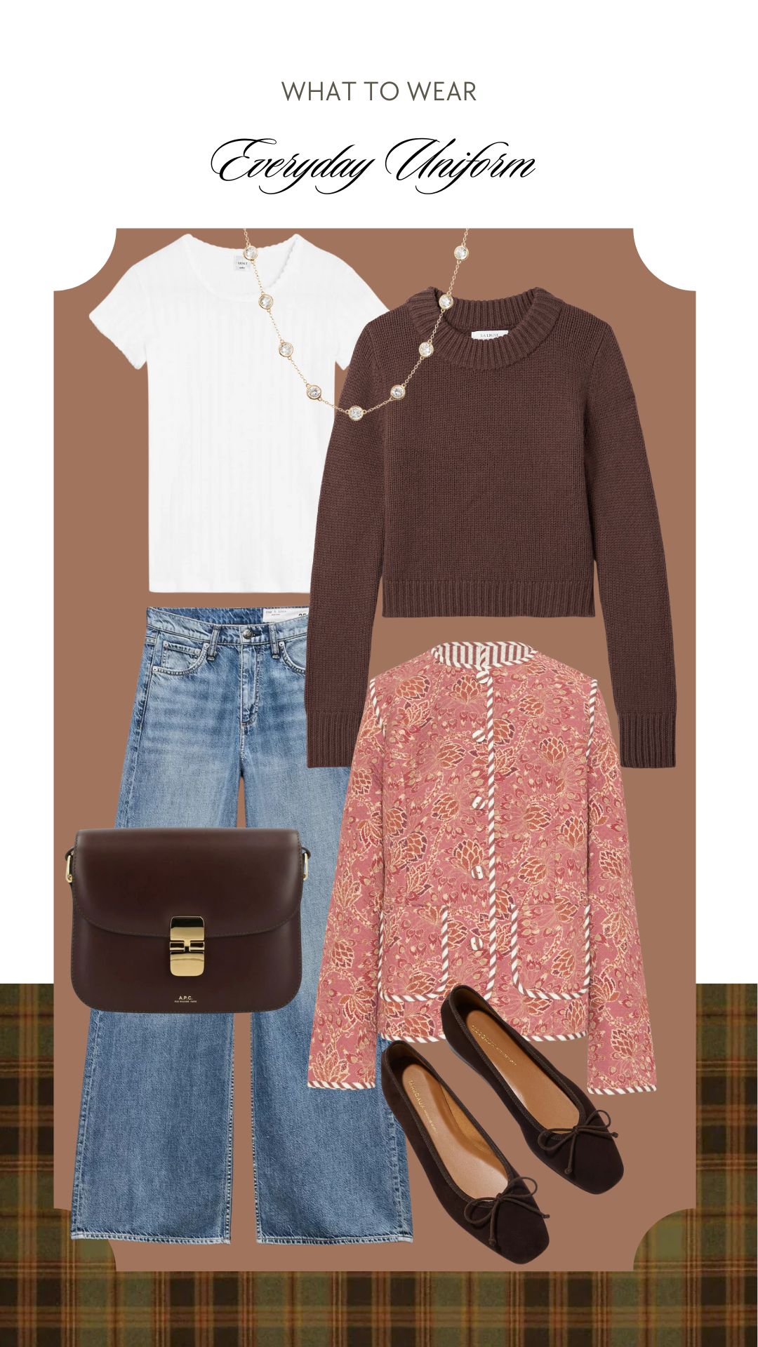 DORSEY CLEMENCE NECKLACE // LESET TEE // LA LIGNE SWEATER (ANOTHER GREAT CHOC BROWN SWEATER HERE) // RAG+BONE FEATHERWEIGHT SOFIE JEANS (USE CODE JEN20) // HILL HOUSE JACKET // MARGAUX FLATS // APC GRACE BAG (LOOK FOR LESS HERE)