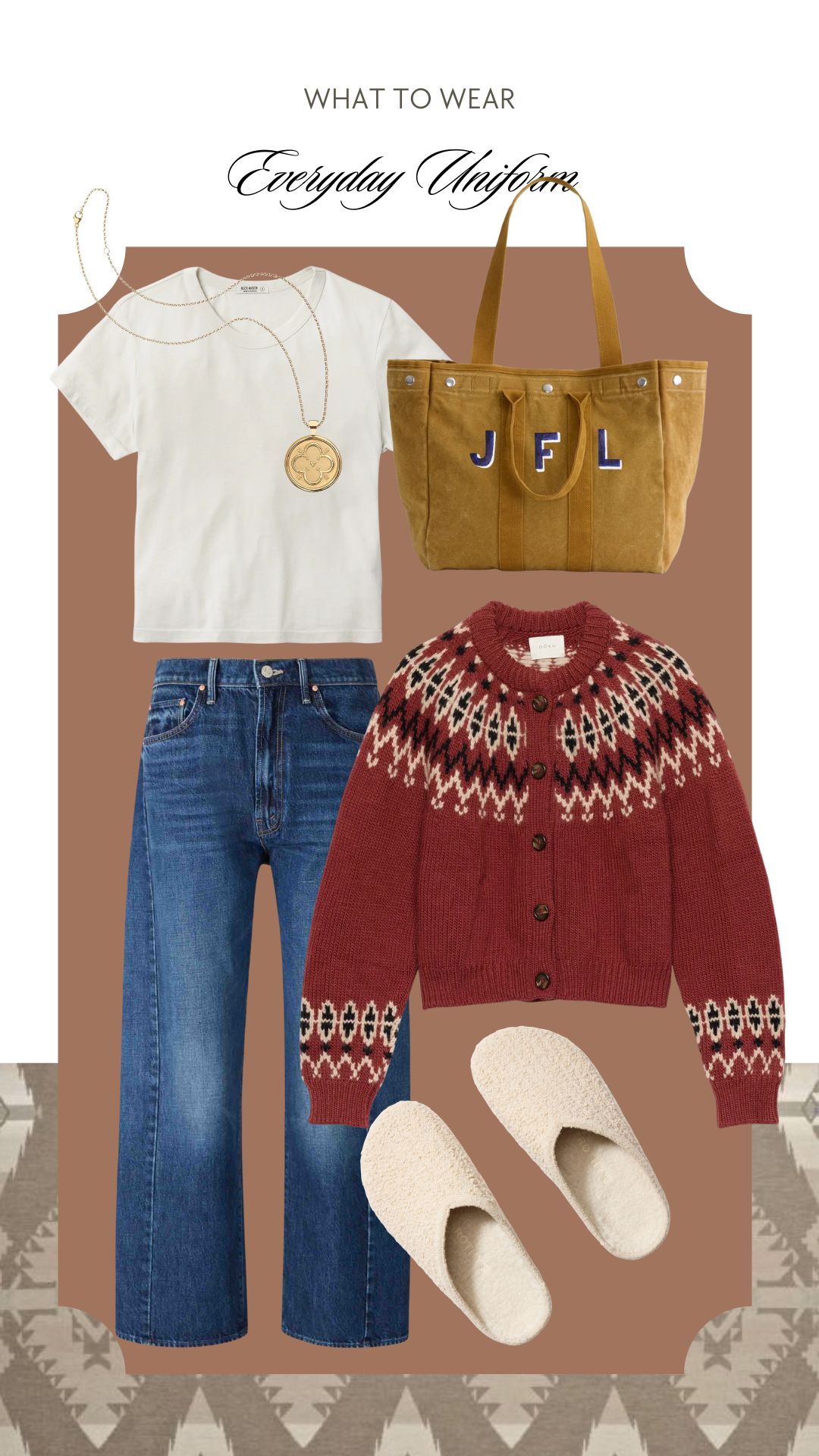 BUCK MASON TEE // MOTHER HALF PIPE JEANS // ALEX MILL TOTE // DOEN CARDIGAN // ROTHY’S CLOGS