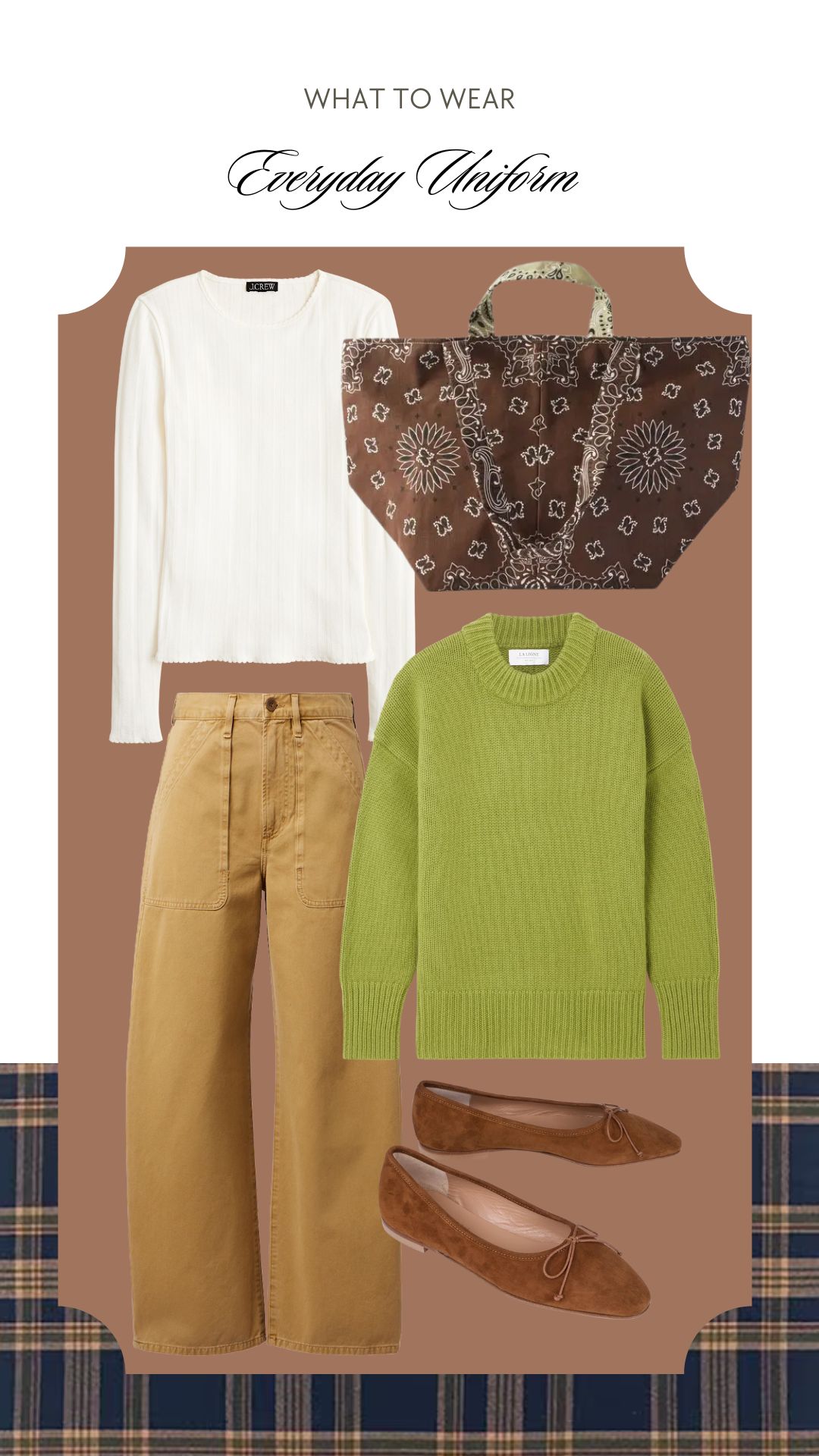 JCREW POINTELLE TEE // AYLA PANTS // CALL IT BY YOUR NAME TOTE // LA LIGNE SWEATER // A. SOLIANI FLATS