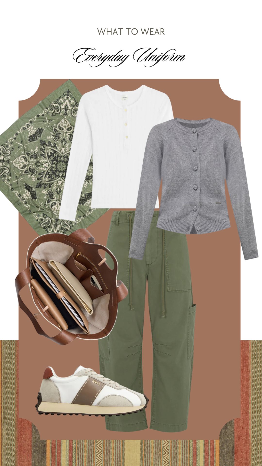 MAISON LECOMTE FLAMENT SCARF // LESET POINTELLE HENLEY // TUCKERNUCK CASHMERE CARDIGAN // CUYANA BAG // PISTOLA SABRINA PANTS // TODS SNEAKERS